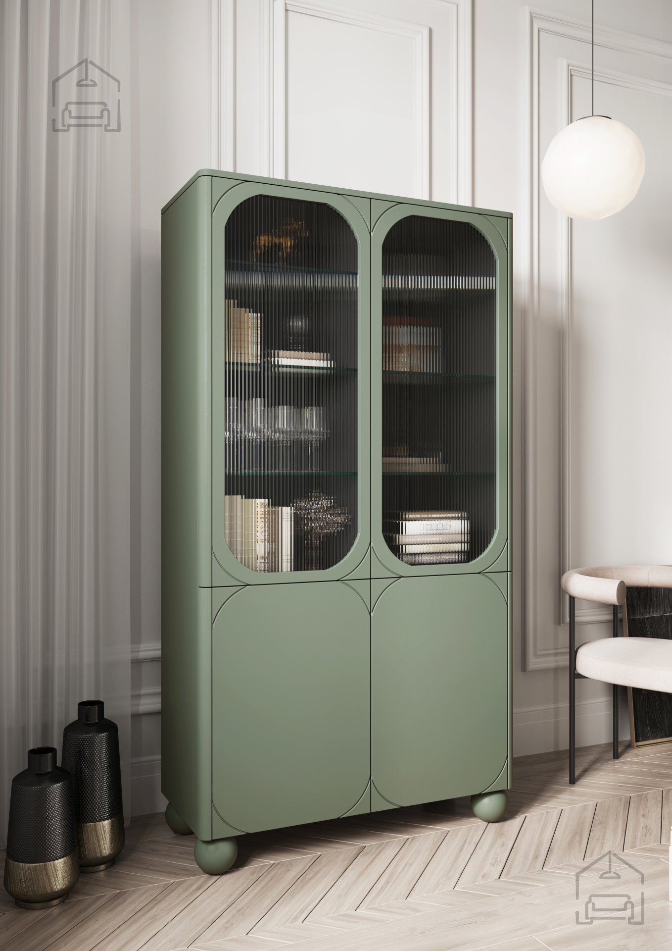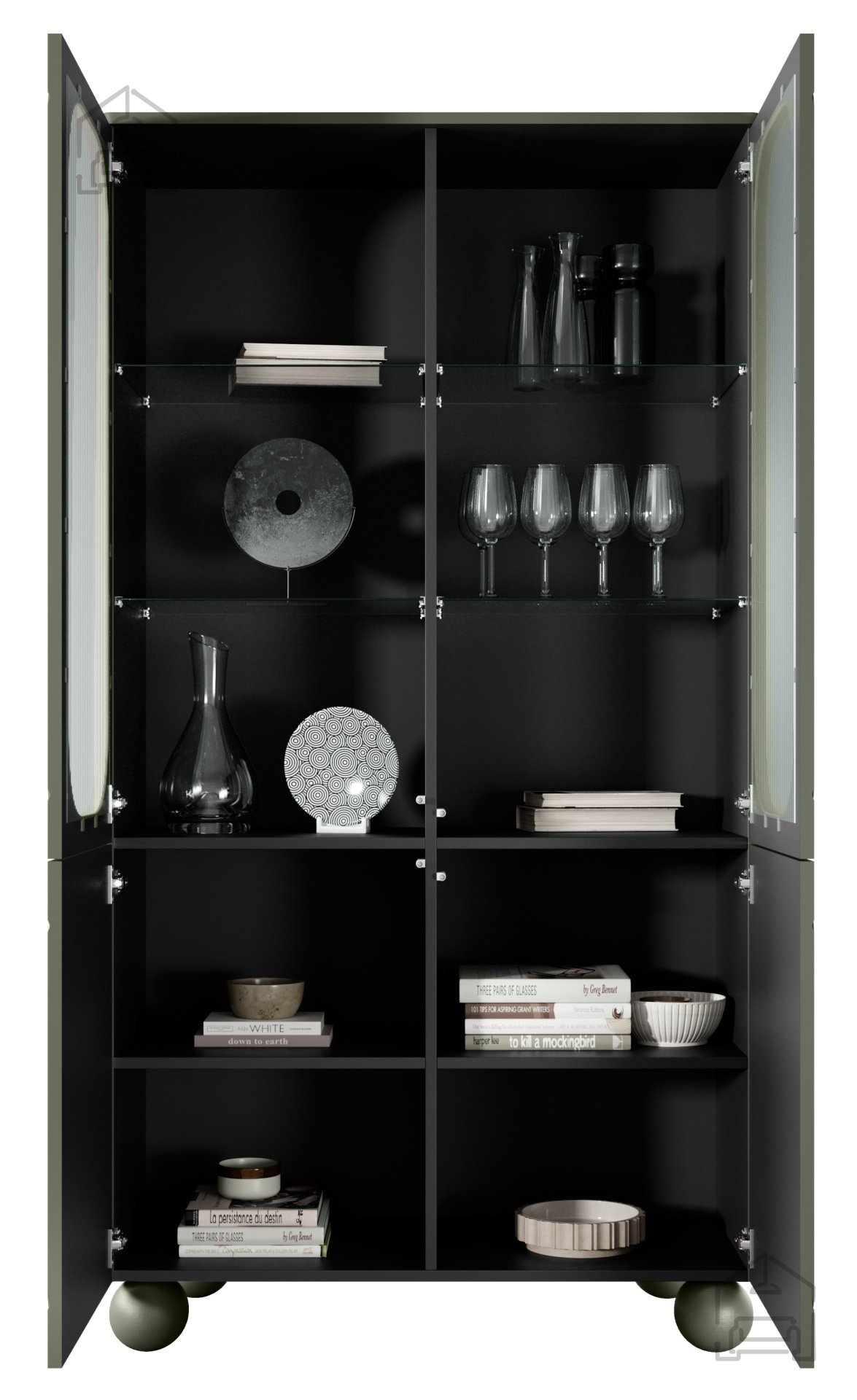 Die olivgrüne Farbe verleiht der Vitrine ein modernes Aussehen, das in jeden Raum passt, unabhängig vom Stil. Schwarze Regale und mittlere Elemente sorgen für einen subtilen Kontrast, der die Blicke all Ihrer Gäste auf sich ziehen wird. Die Beine sind rund und aus Holz, was einen Hauch von natürlicher Wärme und Stabilität hinzufügt, und mit einer Höhe von 12 cm ermöglichen sie eine einfache Reinigung und Pflege des Raums unter der Vitrine.