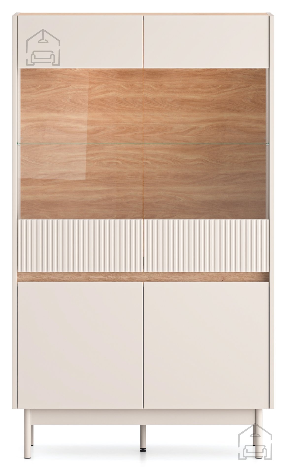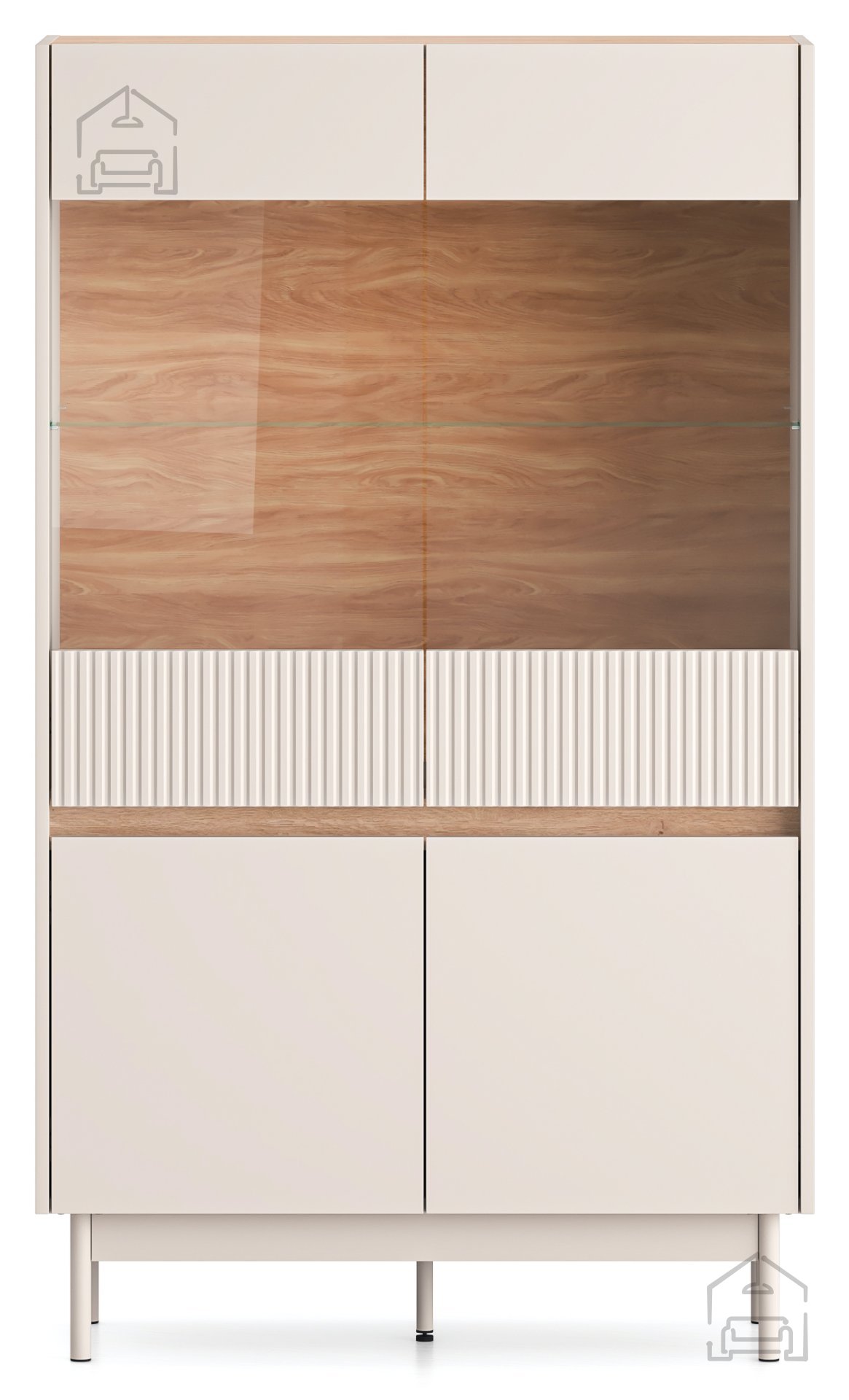 Gefertigt aus hochwertigem MDF und laminierten Spanplatten, garantiert die Vitrine Dunea Langlebigkeit und Widerstandsfähigkeit. Die Außenseite der Vitrine besticht durch eine elegante Kaschmir-Mattfarbe an der Front, die sich nahtlos mit der warmen Eiche-Cremona-Torro-Farbe des Korpus verbindet. Diese Farbkombination verleiht dem Raum einen Hauch von Luxus und Harmonie, der sich leicht an verschiedene Einrichtungsstile anpassen lässt.