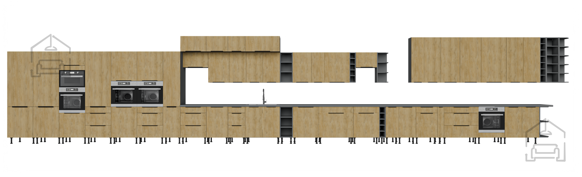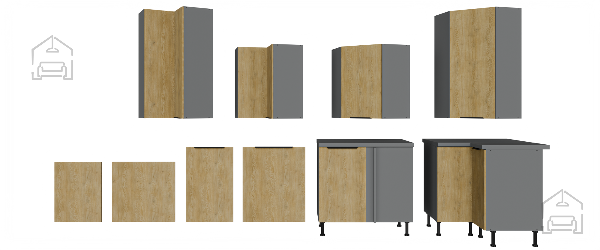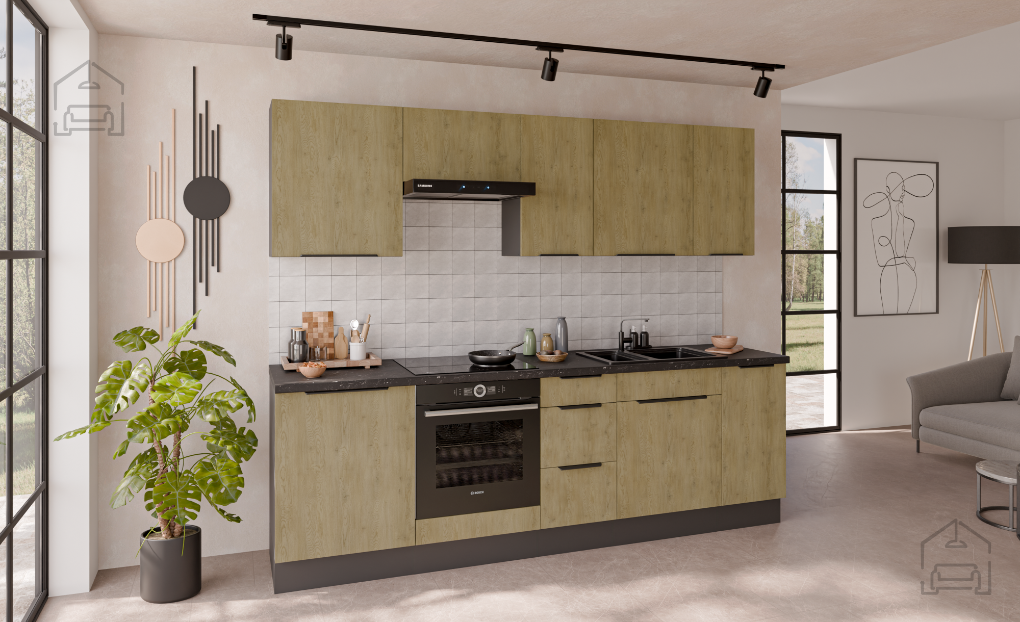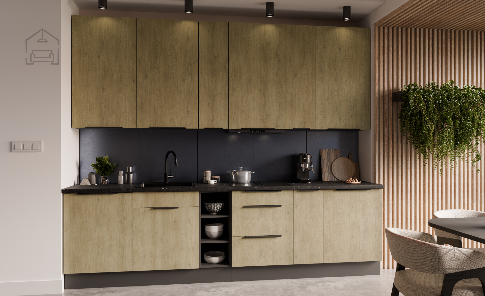 Der Korpus ist mit Melamin beschichtet, während die Fronten mit ABS-Kanten geschützt sind, was die Widerstandsfähigkeit gegen Stöße und Abnutzung erhöht. Das Set umfasst Soft-Close-Systeme, die ein lautes Schließen von Schubladen und Türen verhindern und so Ruhe und Stille in Ihrer Küche bewahren.