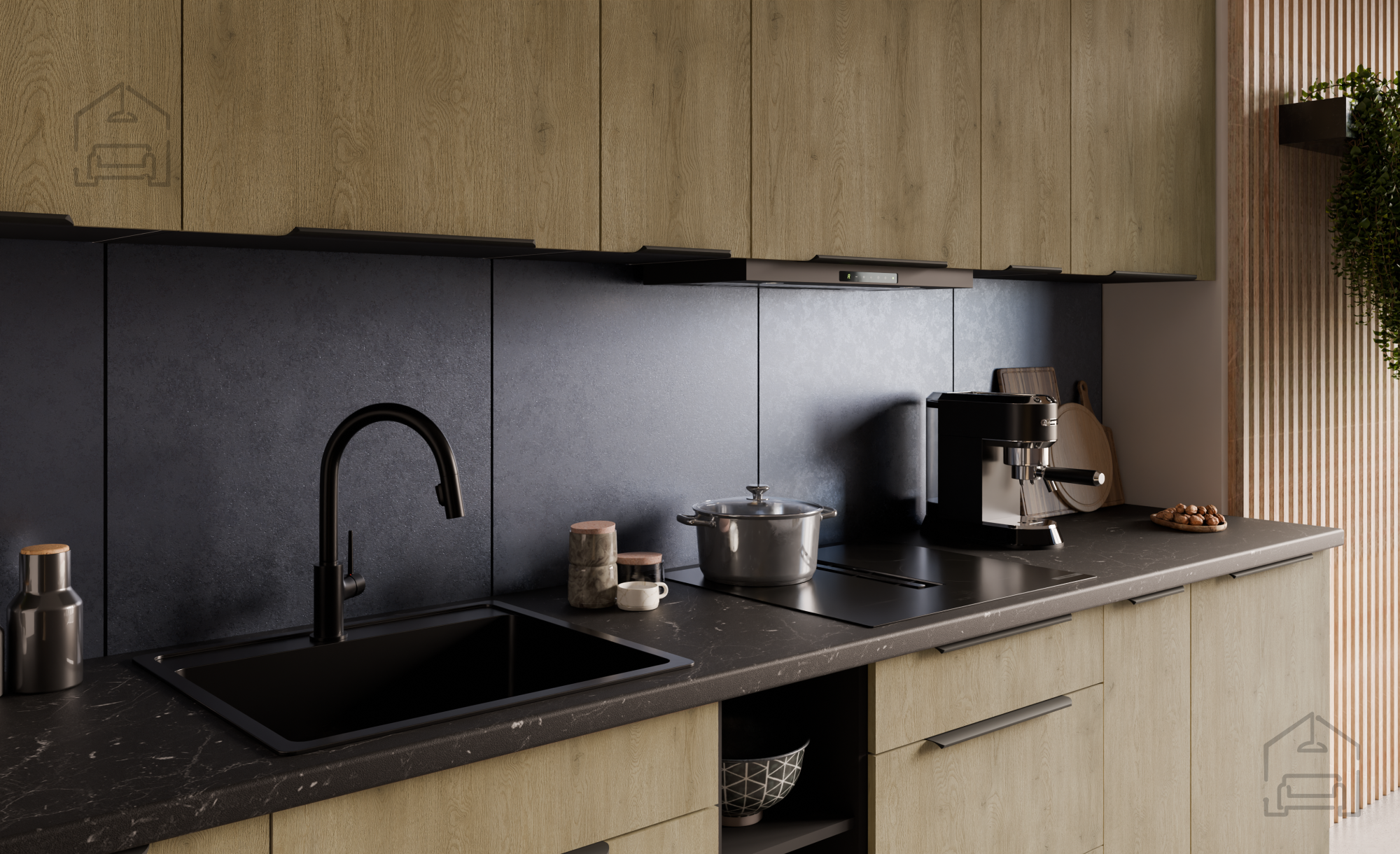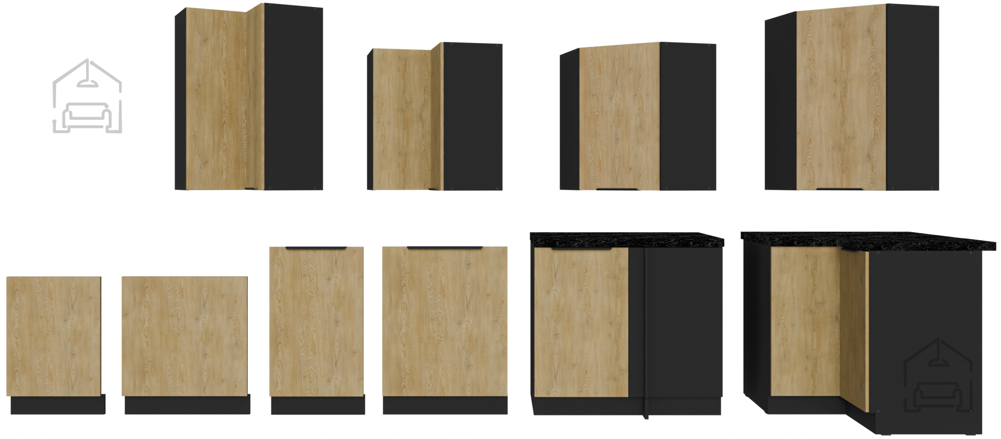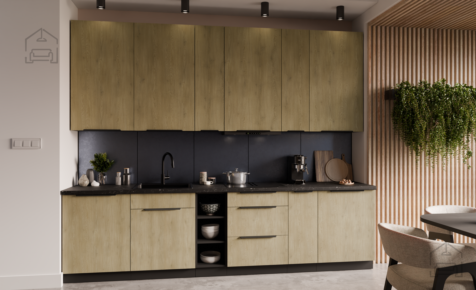 Der Korpus ist mit Melamin beschichtet, während die Fronten mit ABS-Kanten geschützt sind, was die Widerstandsfähigkeit gegen Stöße und Abnutzung erhöht. Das Set enthält Soft-Close, das lautes Schließen von Schubladen und Türen verhindert und so Ruhe und Stille in Ihrer Küche bewahrt.