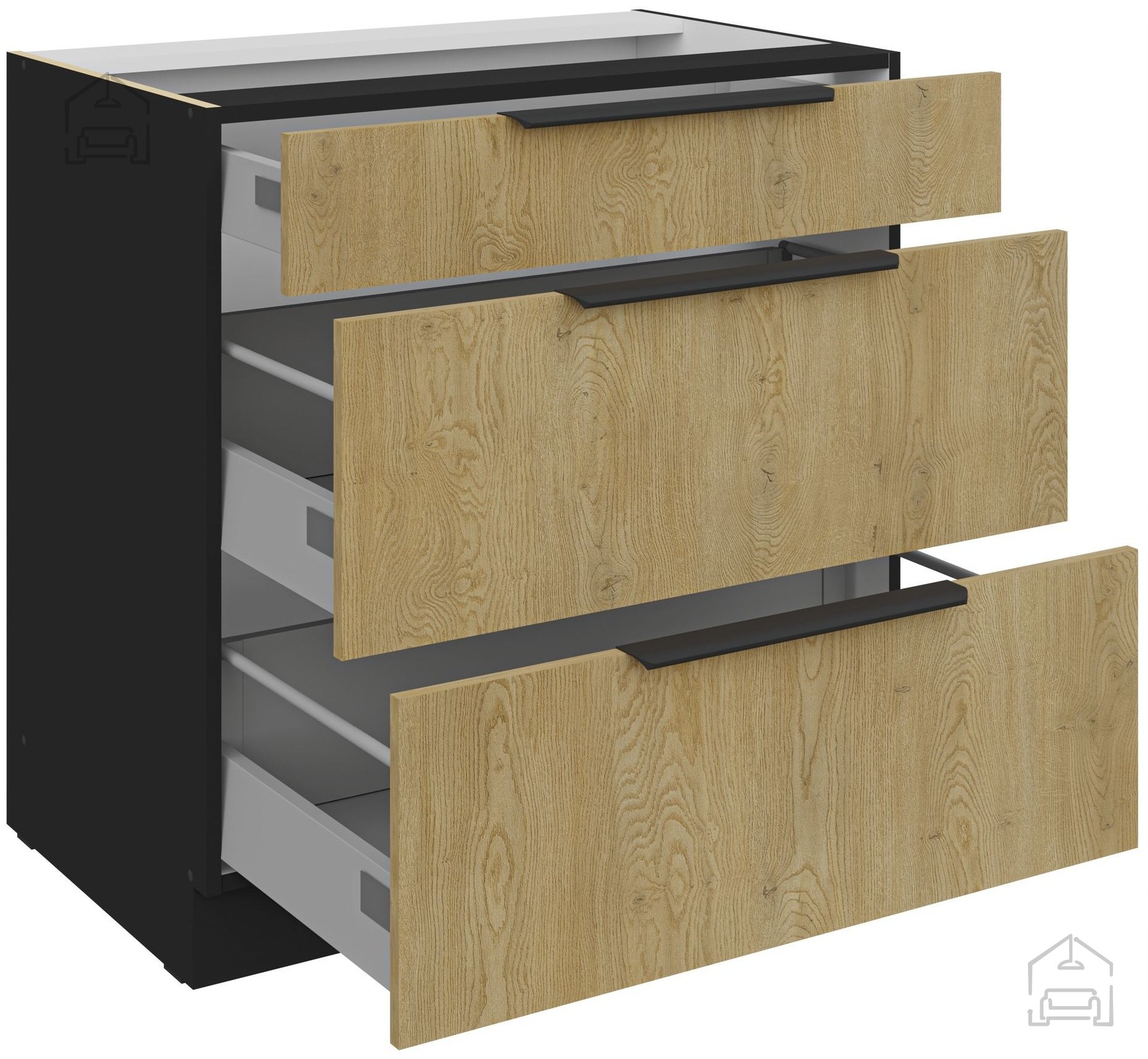 Die Küchenzeile Cremona zeichnet sich durch Material aus 16 mm starker laminierten Platte aus, was Haltbarkeit und eine lange Lebensdauer gewährleistet. Die Fronten in der Farbe Cremona-Eiche verleihen einen Hauch von natürlichem Charme, während der Korpus in Schwarz für eine raffinierte und moderne Ästhetik sorgt. Diese Farbkombination bringt ein warmes Gefühl in jedes Zuhause.