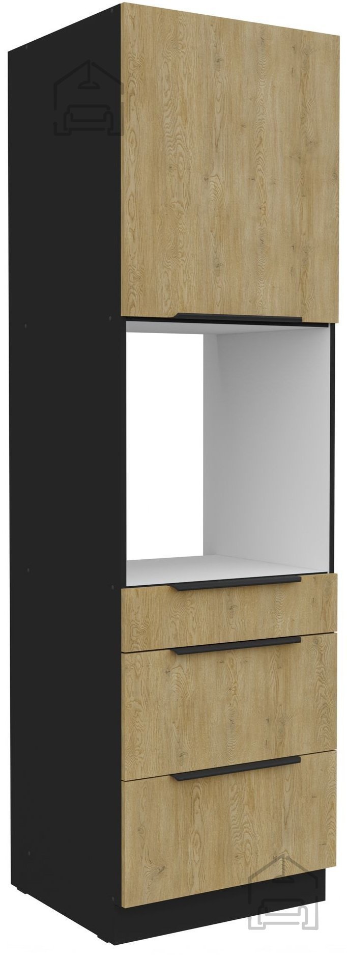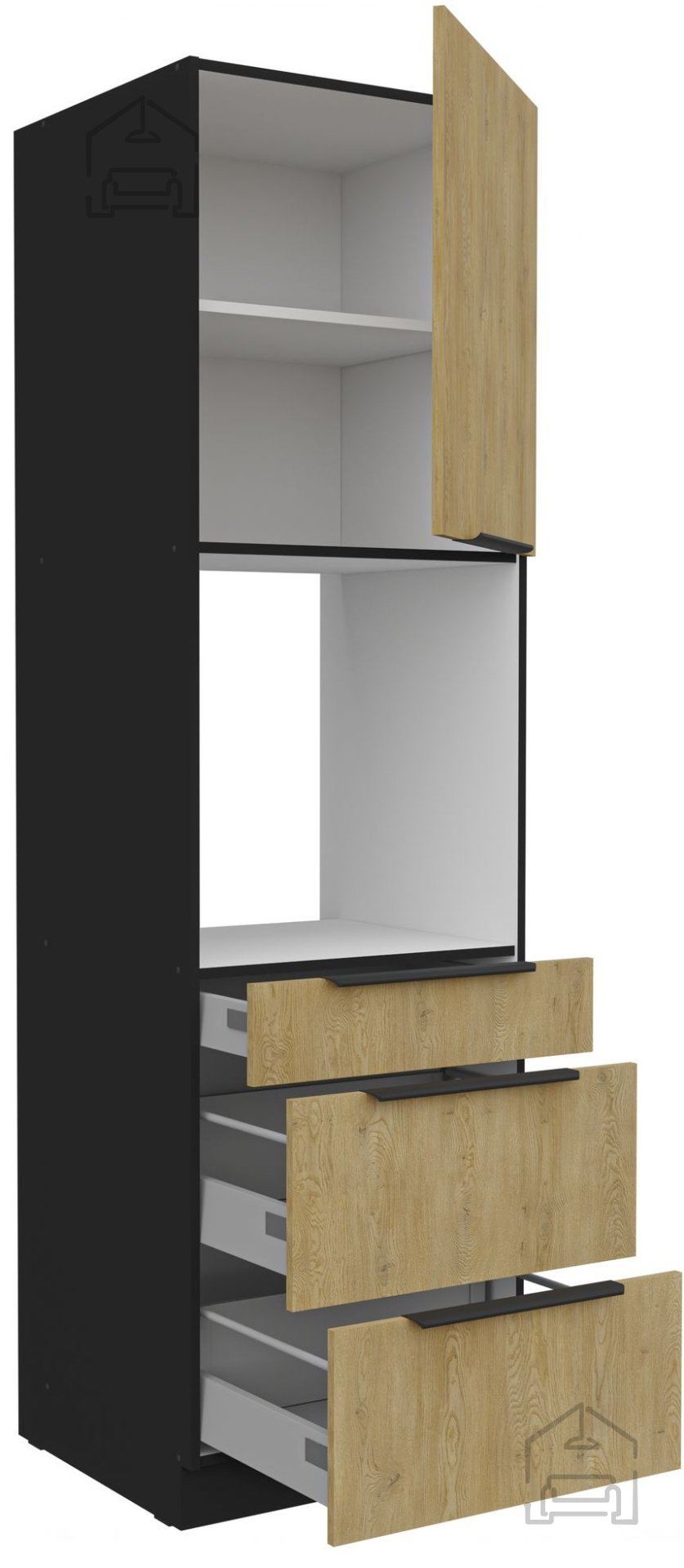 Die Küchenzeile Cremona zeichnet sich durch eine 16 mm starke laminierte Platte aus, die Langlebigkeit und eine lange Lebensdauer gewährleistet. Die Fronten in der Farbe Cremona-Eiche verleihen einen Hauch von natürlichem Charme, während der schwarze Korpus für eine raffinierte und moderne Ästhetik sorgt. Diese Farbkombination bringt ein warmes Gefühl in jedes Zuhause.