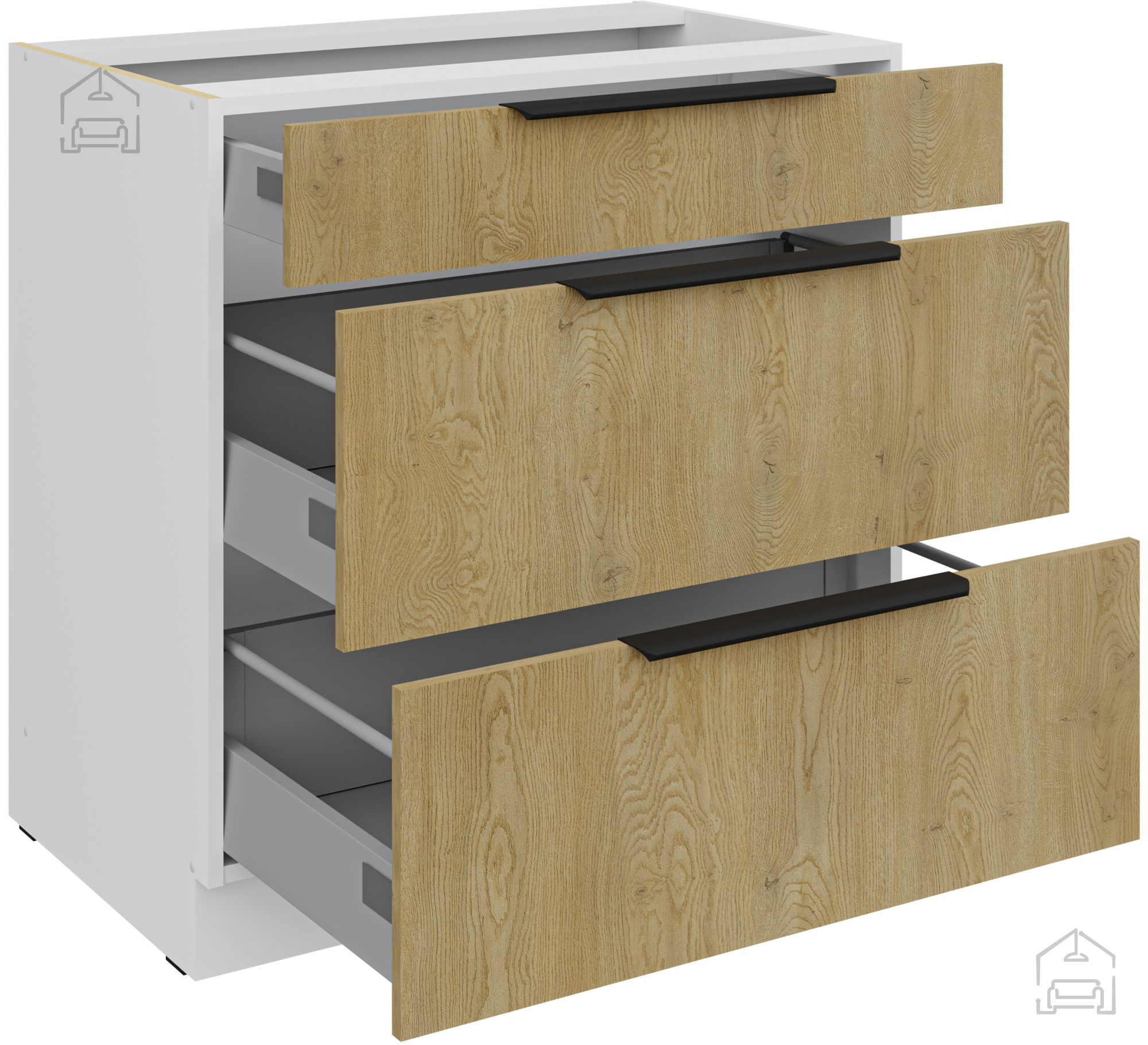 Der Korpus ist mit Melamin beschichtet, während die Fronten mit ABS-Kanten geschützt sind, was die Widerstandsfähigkeit gegen Stöße und Abnutzung erhöht. Die Zeile verfügt über ein Soft-Close-System, das lautes Schließen von Schubladen und Türen verhindert und so Ruhe und Stille in Ihrer Küche bewahrt.