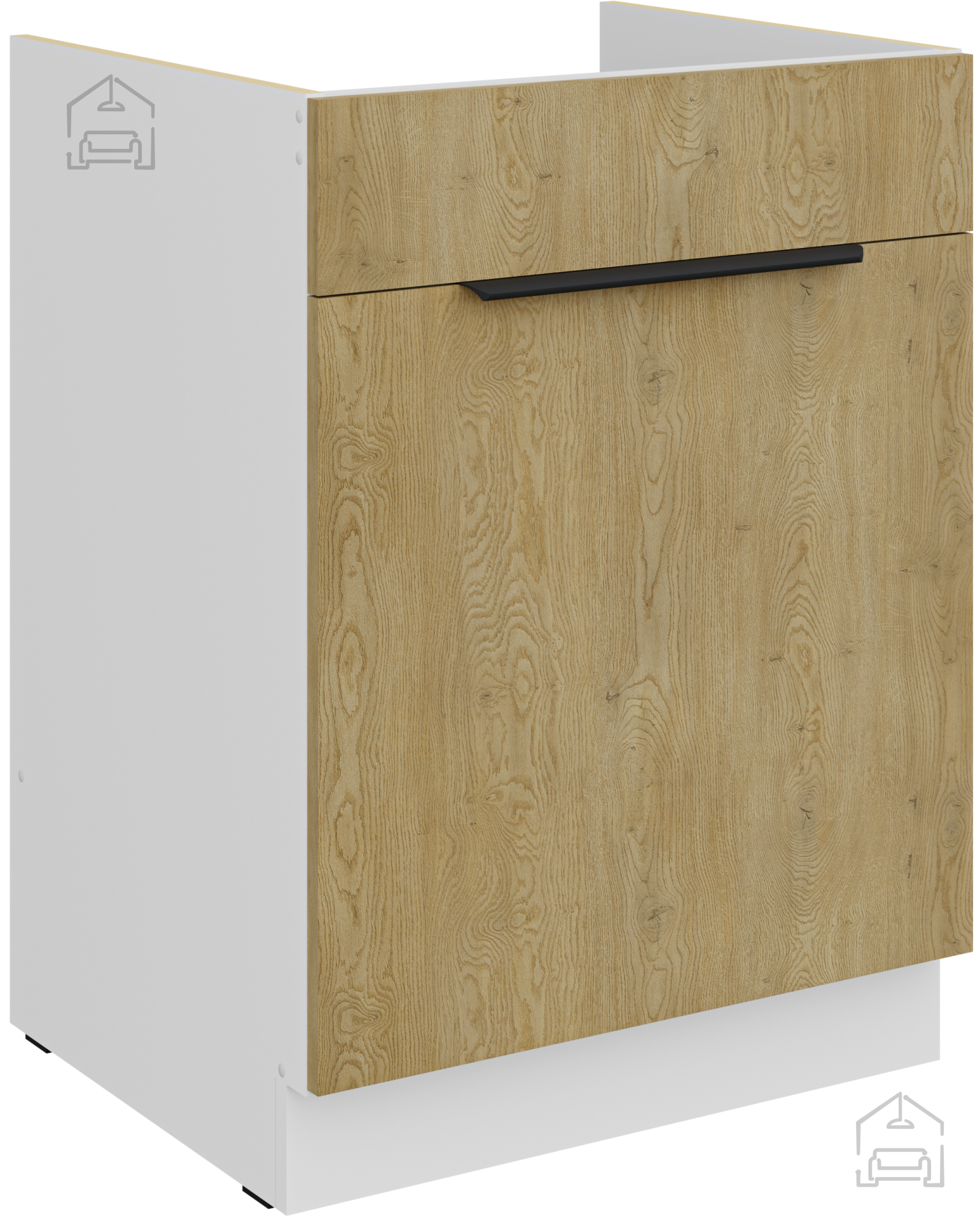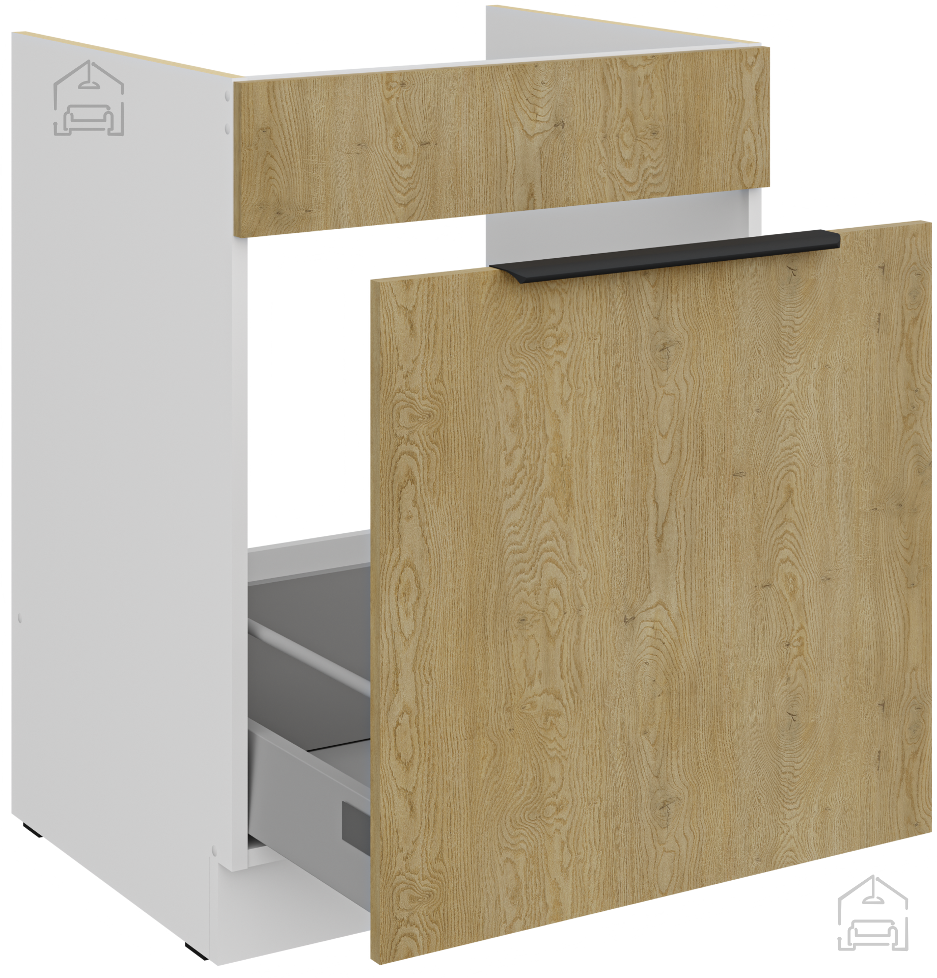 Der Korpus ist mit Melamin beschichtet, während die Fronten mit ABS-Kanten geschützt sind, was die Widerstandsfähigkeit gegen Stöße und Abnutzung erhöht. Das Set enthält Soft-Close-Systeme, die lautes Schließen von Schubladen und Türen verhindern und so Ruhe und Stille in Ihrer Küche bewahren.