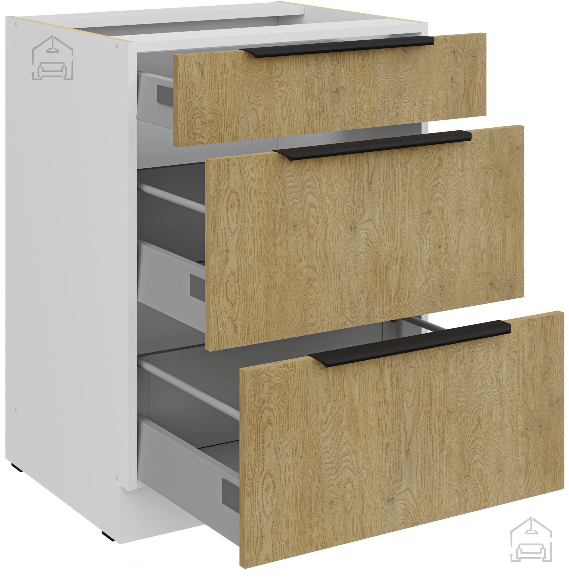 Der Korpus ist mit Melamin beschichtet, während die Fronten mit ABS-Kanten geschützt sind, was die Widerstandsfähigkeit gegen Stöße und Abnutzung erhöht. Das Set enthält Soft-Close-Systeme, die ein lautes Schließen von Schubladen und Türen verhindern und so Ruhe und Stille in Ihrer Küche bewahren.