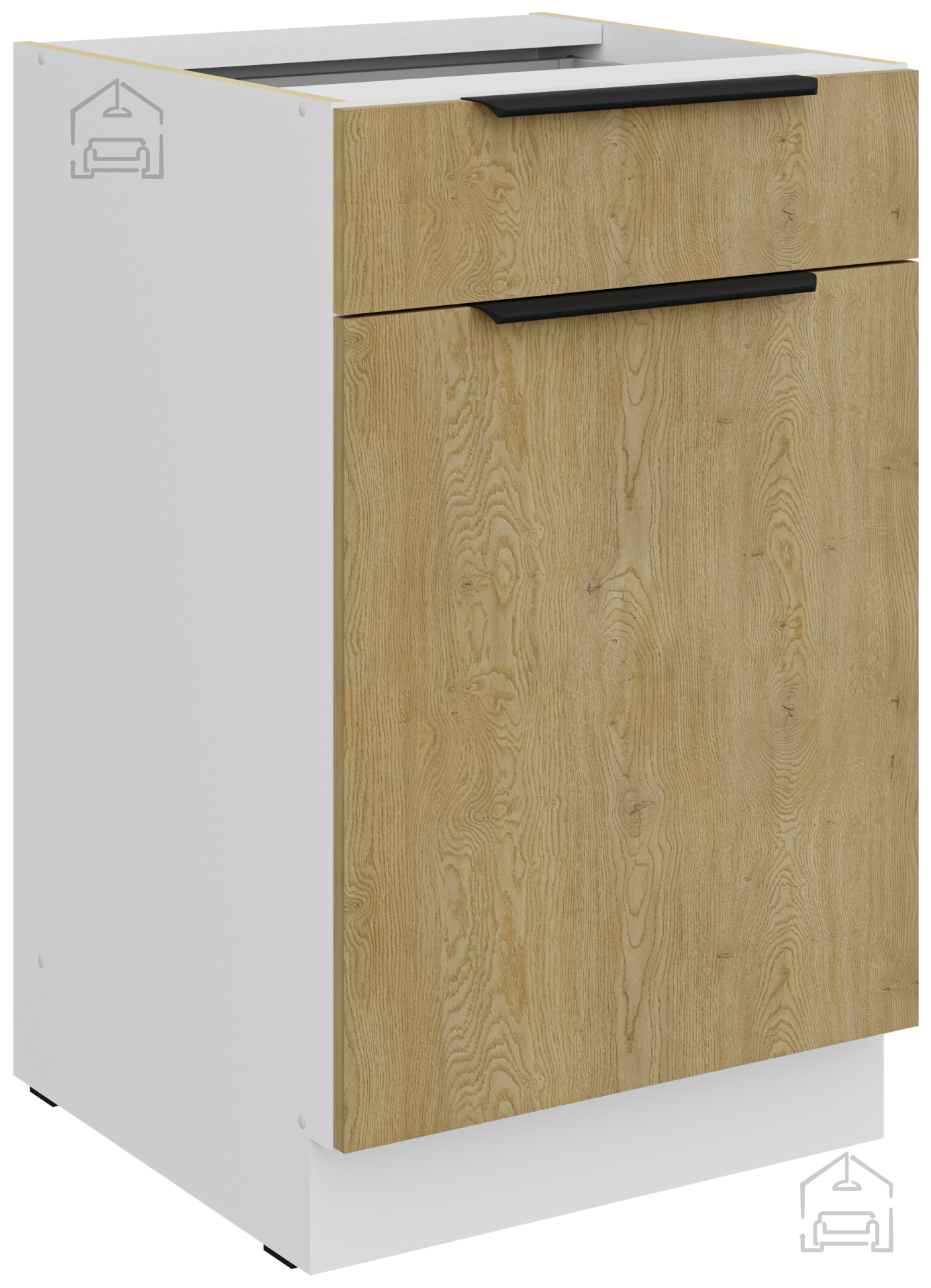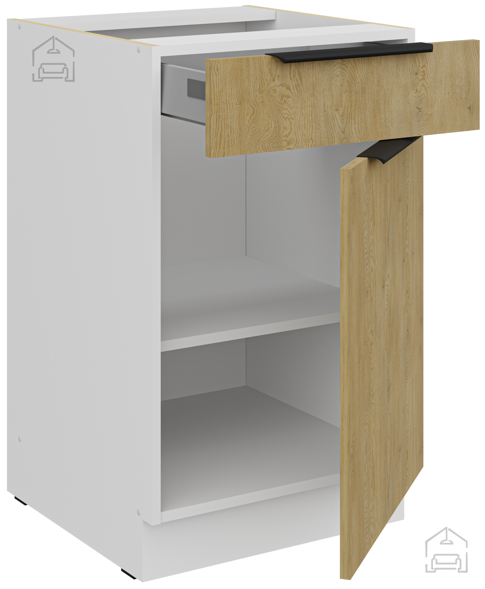Der Korpus ist mit Melamin beschichtet, während die Fronten mit ABS-Kanten geschützt sind, was die Widerstandsfähigkeit gegen Stöße und Abnutzung erhöht. Das Set umfasst Soft-Close, das lautes Schließen von Schubladen und Türen verhindert und so Ruhe und Stille in Ihrer Küche bewahrt.
