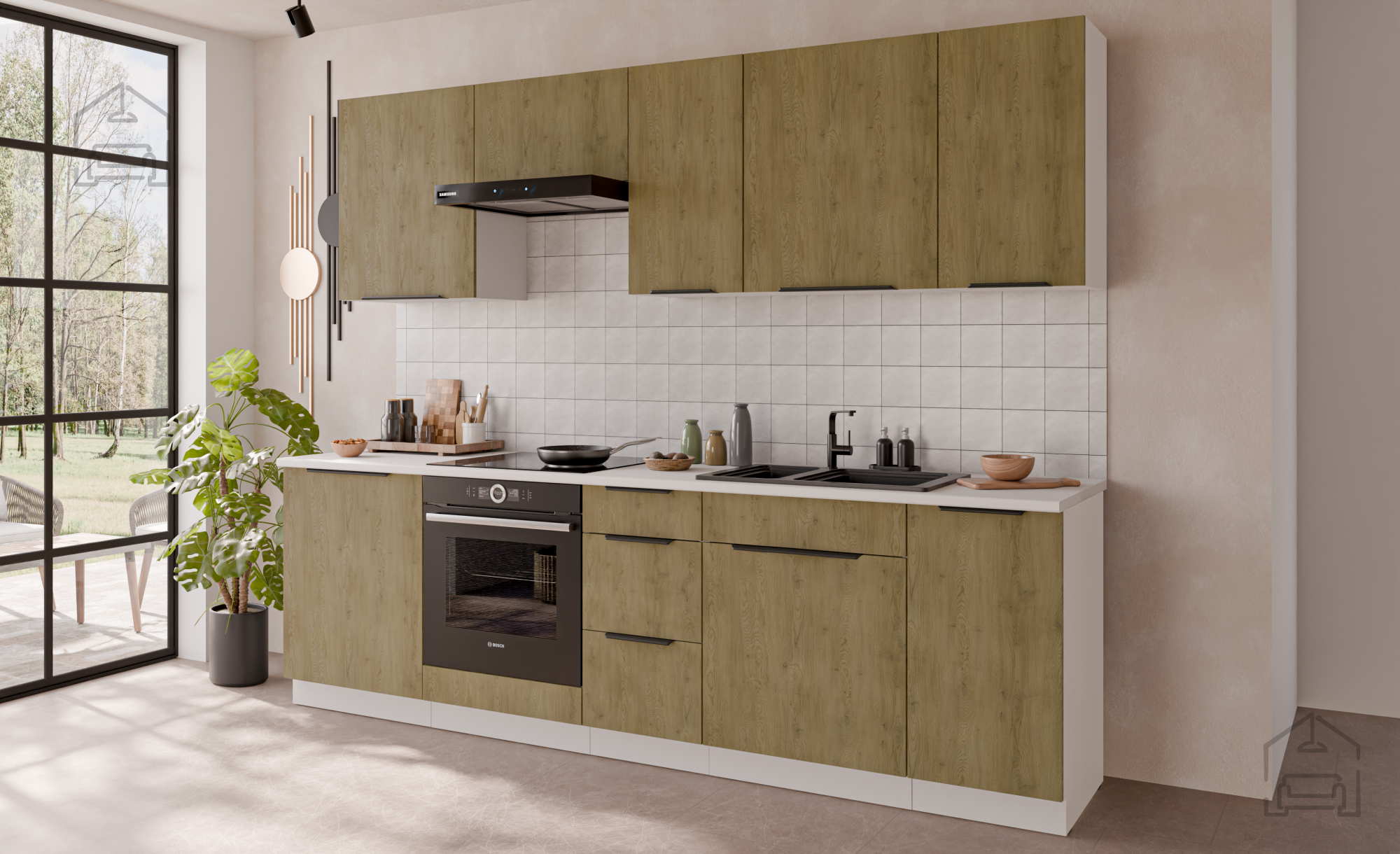 Der Korpus ist mit Melamin versehen, während die Fronten mit ABS-Kanten geschützt sind, was die Widerstandsfähigkeit gegen Stöße und Abnutzung erhöht. Das Set beinhaltet Soft-Close-System, das ein lautes Schließen von Schubladen und Türen verhindert und somit Ruhe und Stille in Ihrer Küche bewahrt.
