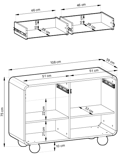Mit den Maßen 108x39x75 cm bietet die Kommode Albion 108 viel Stauraum für Ihre Gegenstände. Ihre geräumigen Schubladen und Regale ermöglichen eine einfache Organisation, was Ihrem Zuhause Ordnung und Übersichtlichkeit verleiht.