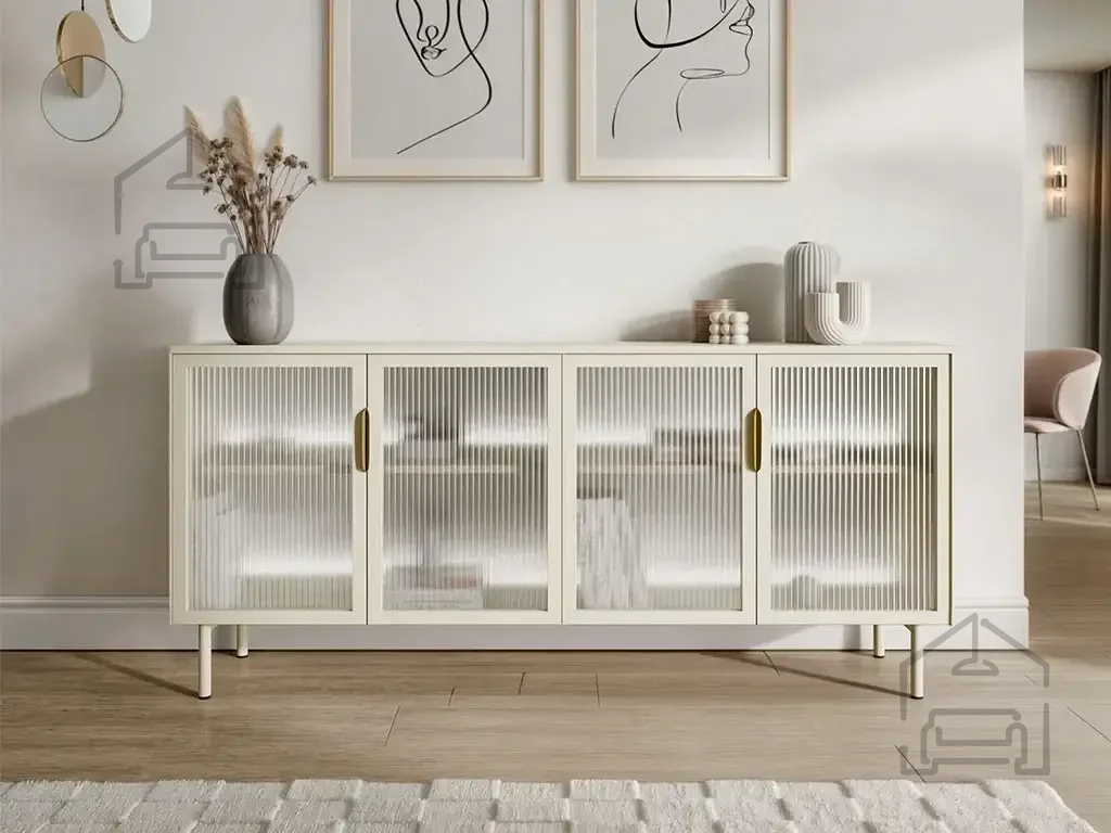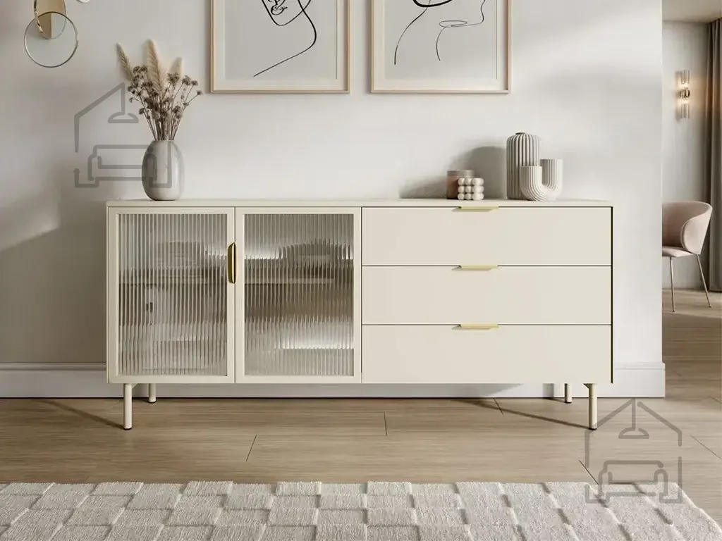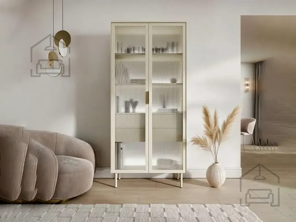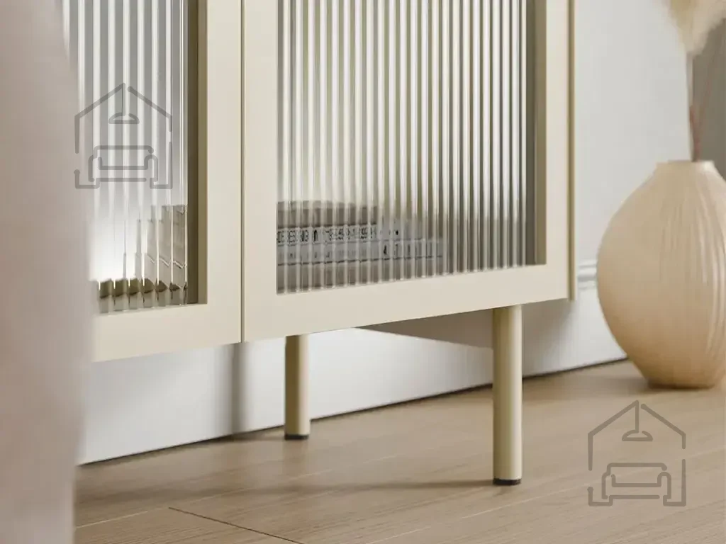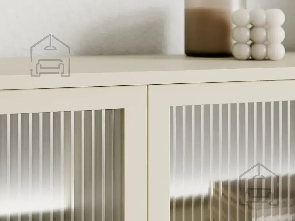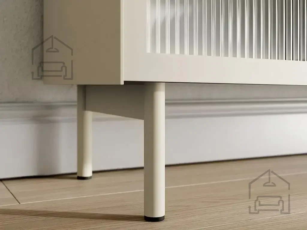 Der Kaschmirton bringt Wärme und Ruhe in den Raum und lässt sich zugleich leicht mit anderen Farben und Materialien kombinieren. Klare Linien, gehärtetes Glas an den Fronten und Rahmen aus hochwertigem MDF schaffen ein edles Erscheinungsbild, das sowohl Minimalismus-Liebhaber als auch Anhänger klassischer Eleganz begeistert. Schwarze Metallbeine und Griffe sorgen für einen subtilen Kontrast und verleihen einen modernen Akzent.