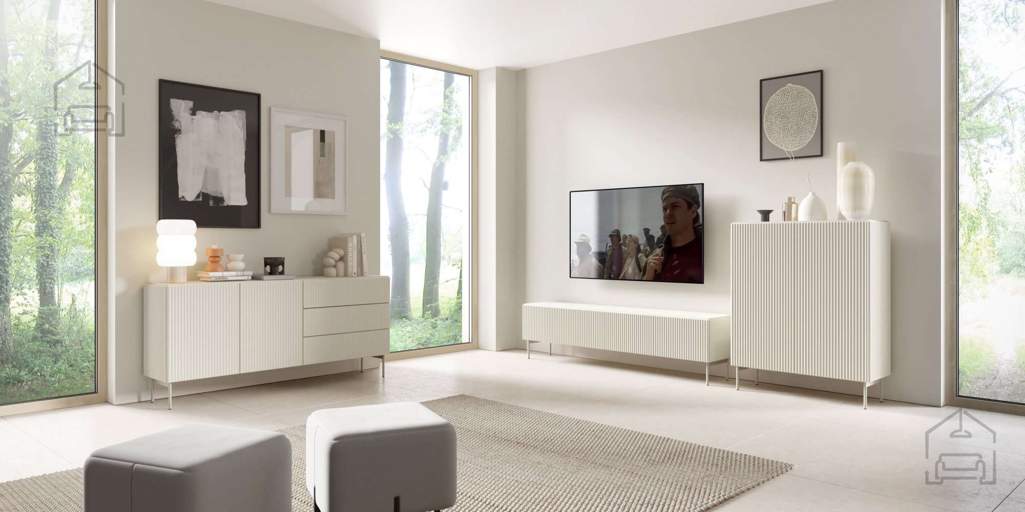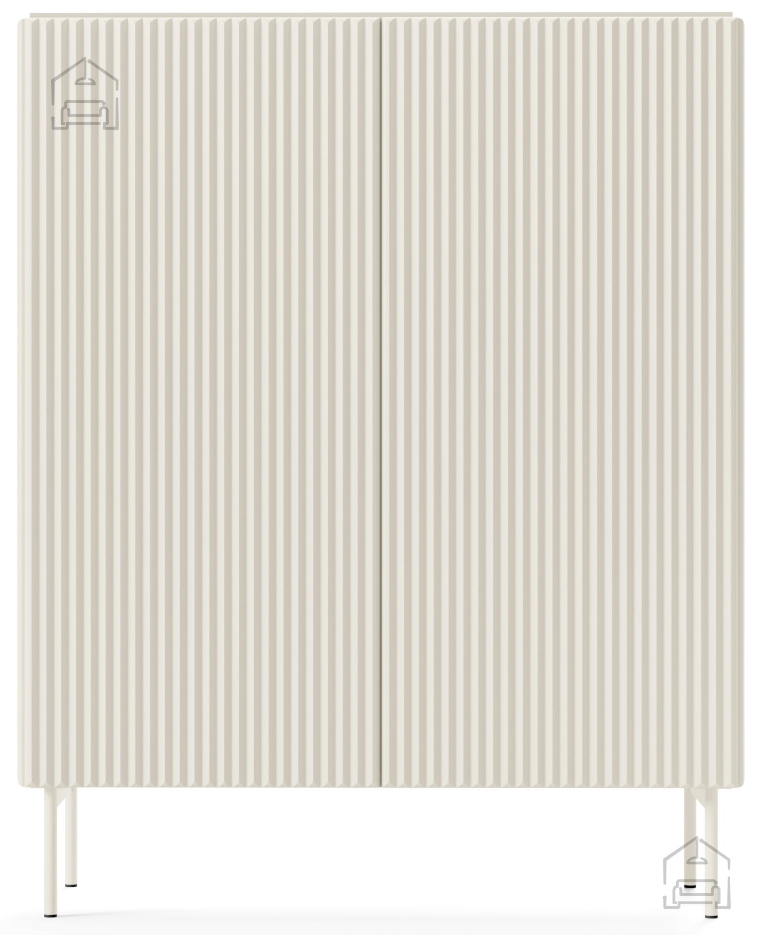 Gefertigt aus einer Kombination von 18 mm gefräster MDF-Platte und 16 mm laminierten Spanplatten der Klasse E05, ist dieses Möbelstück widerstandsfähig, stabil und sicher für den Einsatz in Wohnräumen. Die Vorderseite ziert eine markante gefräste Oberfläche, die ihr einen besonderen Charakter verleiht, während die Kanten mit einem ABS-Band in derselben Farbe versehen sind – für ein ästhetisch perfektes Erscheinungsbild und zusätzlichen Schutz vor Beschädigungen.