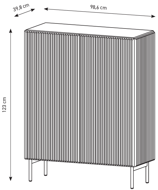 Die Maße 98,6 × 39,8 × 123 cm bieten ein optimales Verhältnis zwischen Geräumigkeit und Kompaktheit. Die Kommode ist hoch genug, um im Inneren reichlich Stauraum zu bieten, ohne den Raum zu überladen. Sie ist ideal zur Aufbewahrung von Kleidung, Bettwäsche, Dokumenten oder dekorativen Gegenständen, die Sie ordentlich und griffbereit haben möchten.