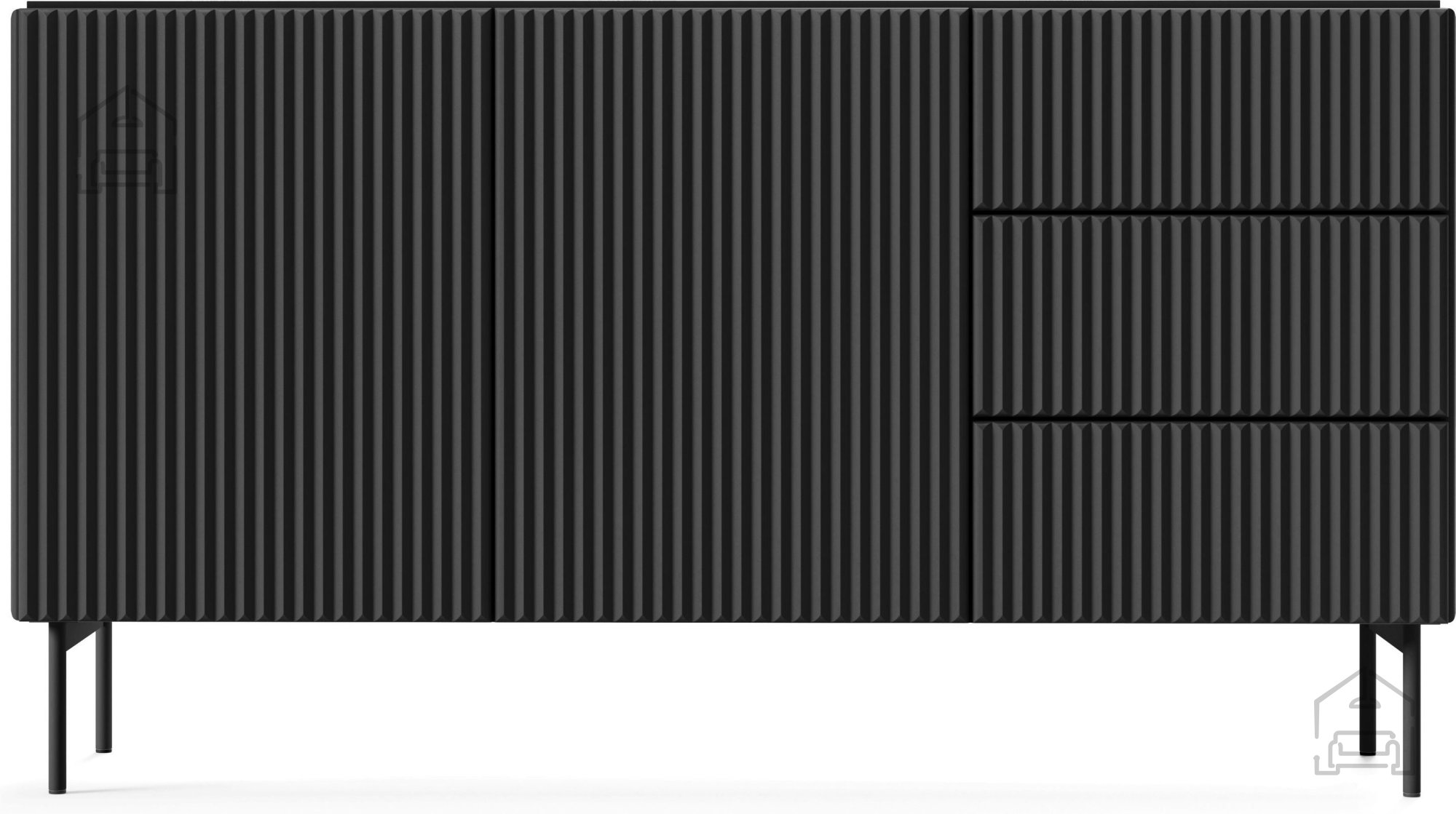 Die Kombination aus tiefem Schwarz und subtilen Rillen an den Fronten schafft ein besonders edles Erscheinungsbild, das sowohl zu modernen als auch klassischen Räumen passt. Dank der ABS-Kante in Plattenfarbe sind die Ränder zusätzlich vor Stößen und Abnutzung geschützt, wodurch die makellose Optik über viele Jahre hinweg erhalten bleibt. Die schwarze Farbe harmoniert hervorragend mit verschiedenen Materialien und Farbkombinationen, sodass die Kommode leicht mit bestehendem Mobiliar und Dekor abgestimmt werden kann.