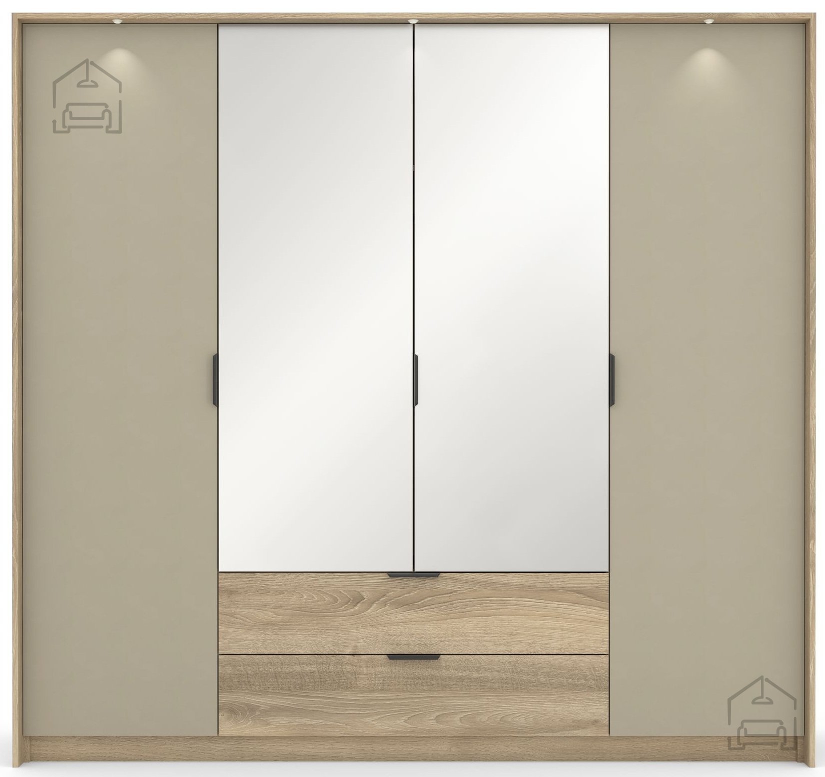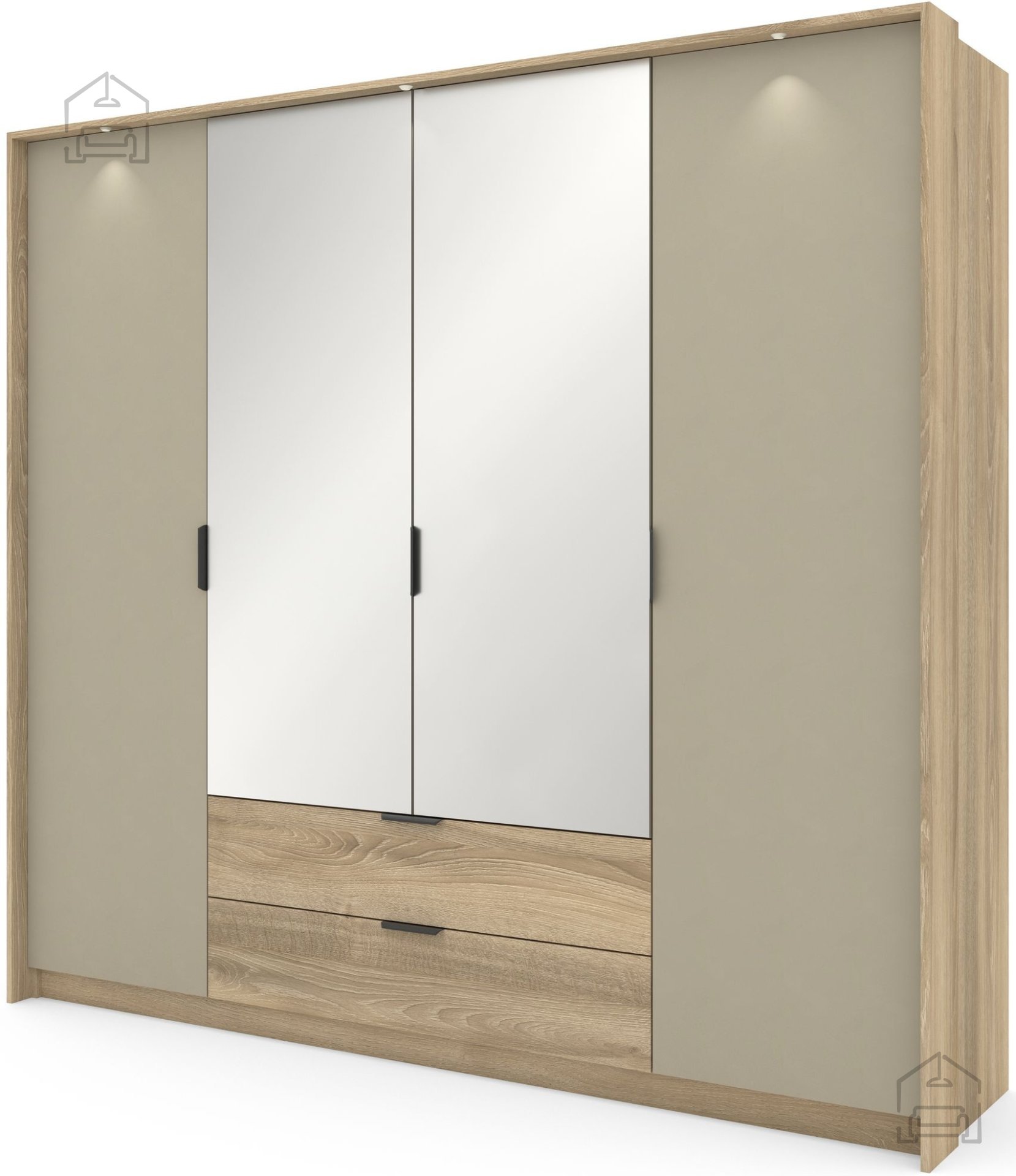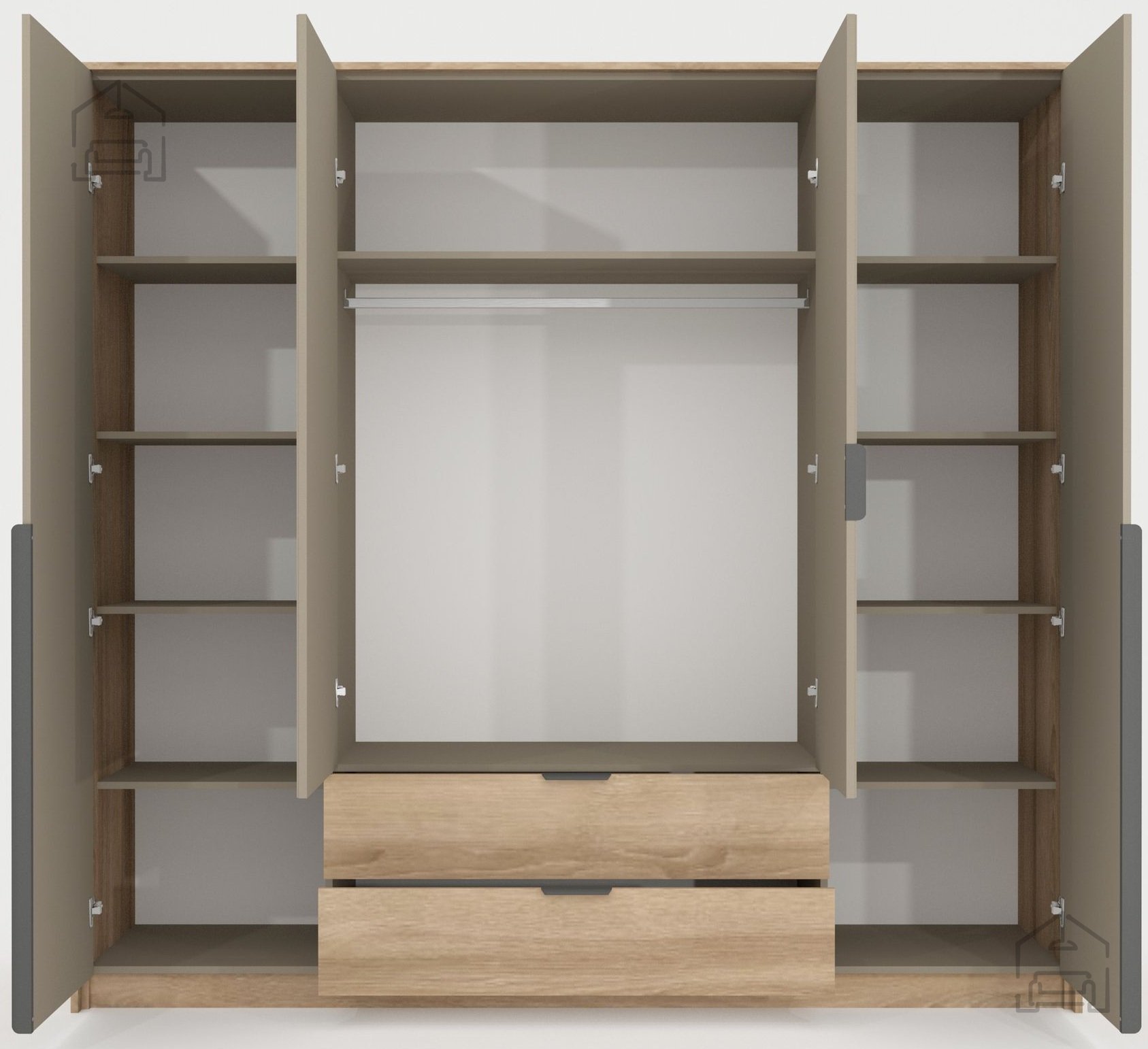 Im Inneren erwartet Sie eine durchdachte Anordnung von Regalböden, Kleiderstangen und Schubladen, die eine übersichtliche Aufbewahrung Ihrer Kleidung ermöglichen. Die Schubladen sind mit hochwertigen Kugelführungen mit Vollauszug und Soft-Close ausgestattet, was eine leise und komfortable Nutzung bedeutet. Die Türen schließen mit doppelten Überlappungsschanieren mit Soft-Close, die unangenehmes Zuschlagen verhindern und die Lebensdauer der Möbel verlängern.