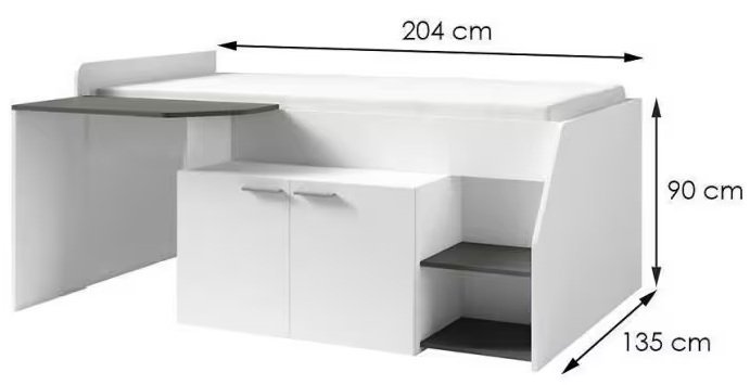 Die Maße 135x204x90 cm ermöglichen es, dass sich das Möbelstück problemlos auch in kleinere Räume einfügt, ohne dabei Komfort oder Stauraum zu opfern. Die Kombination aus Weiß und Grau verleiht ein modernes, aber dennoch neutrales Erscheinungsbild, das sich leicht mit verschiedenen Einrichtungsstilen kombinieren lässt – von minimalistisch bis hin zu verspielteren Jugendzimmer-Designs. Dank der 3-in-1-Funktionalität erhalten Sie ein Bett für erholsamen Schlaf, einen Schreibtisch für Hausaufgaben oder kreative Tätigkeiten sowie einen Schrank für Kleidung, Schulutensilien oder persönliche Gegenstände.