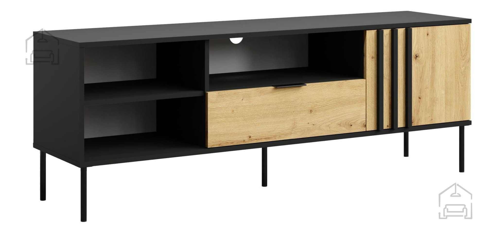 Die Maße 160x40x58 cm ermöglichen es, dass das Board problemlos Fernseher verschiedener Größen aufnehmen kann und gleichzeitig viel Stauraum bietet. Die schwarze Farbe in Kombination mit Artisan-Eiche-Dekor sorgt für einen Kontrast, der einen modernen, aber zugleich gemütlichen Look schafft. Minimalistische Kunststoffgriffe werden durch elegante Metallbeine ergänzt, die dem Board Stabilität und einen modernen Touch verleihen. Durch die erhöhte Konstruktion ist die Reinigung des Bodens darunter einfach und schnell.