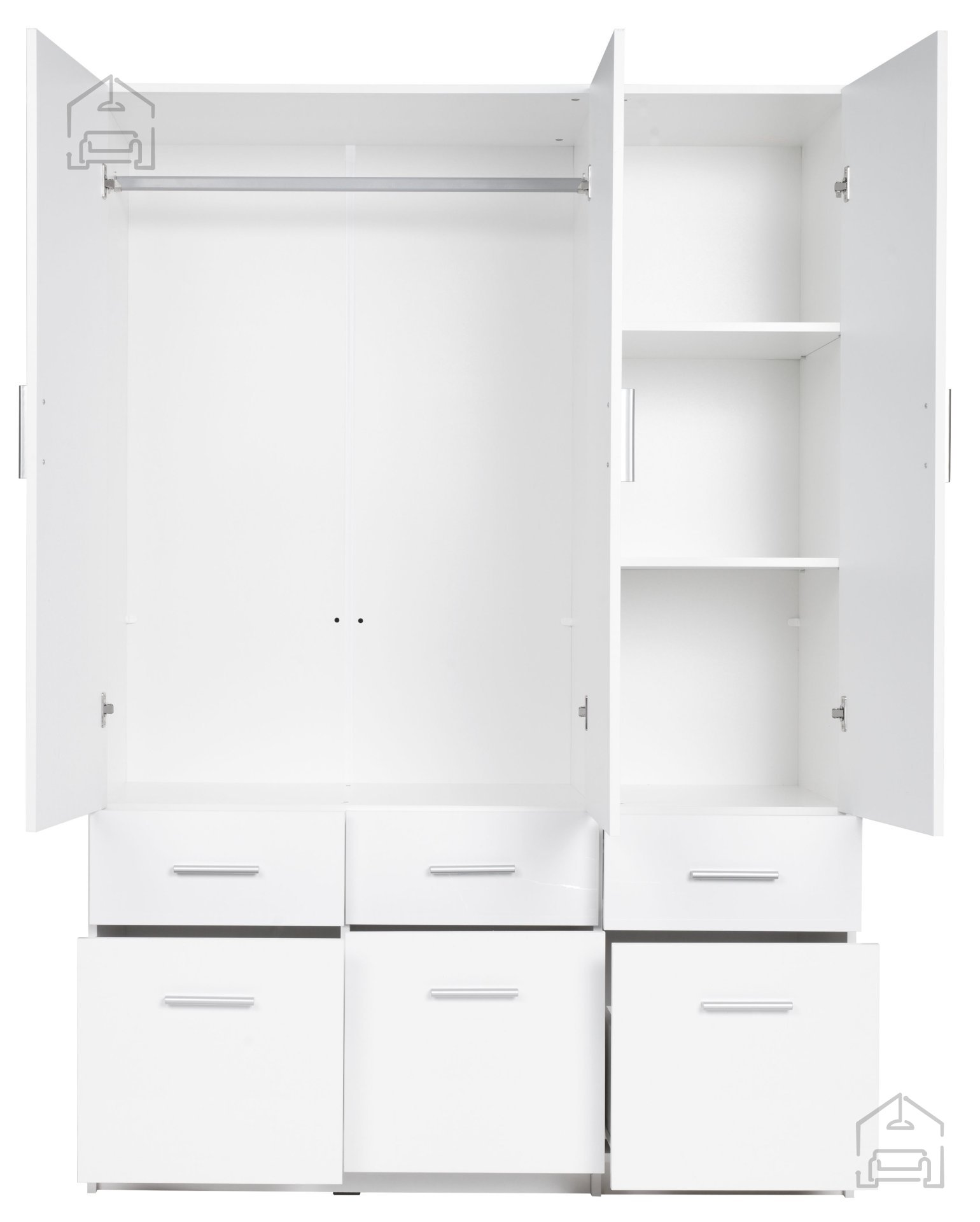 Der elegante und geräumige Kleiderschrank ist die perfekte Lösung für alle, die sich ein ordentliches und übersichtliches Schlafzimmer, Vorzimmer oder Ankleidezimmer wünschen. Mit seinem modernen Design in klassischem Weiß fügt er sich problemlos in verschiedene Einrichtungsstile ein und verleiht dem Raum zugleich ein Gefühl von Frische und Leichtigkeit. Die Kombination aus drei Türen und praktischen Schubladen ermöglicht eine optimale Organisation von Kleidung, Schuhen und Accessoires, sodass jedes Teil stets an seinem Platz ist.