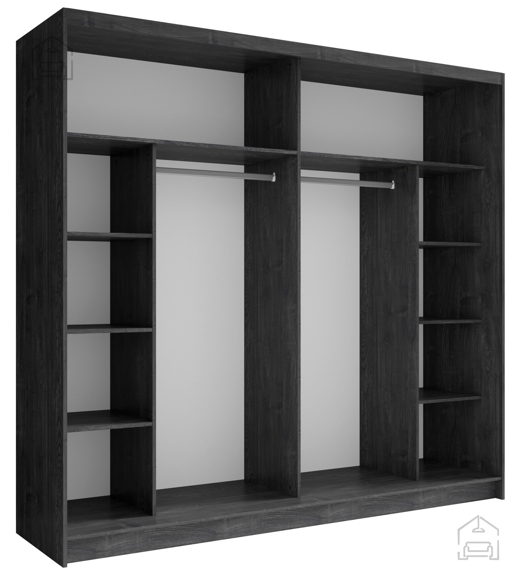 Das Innere des Kleiderschranks ist so gestaltet, dass es den Bedürfnissen moderner Nutzer entspricht. Es bietet eine Kombination aus Regalen und Hängeflächen, sodass Sie sowohl gefaltete Kleidung als auch Kleider, Mäntel und Sakkos problemlos verstauen können. So behalten Sie stets den Überblick über Ihre Garderobe, was die tägliche Kleiderwahl erleichtert.