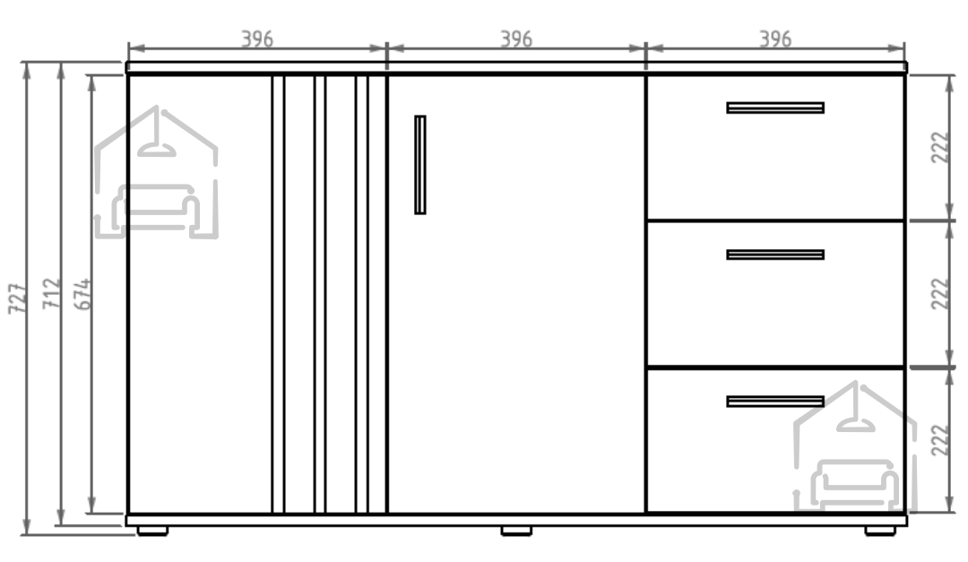 Die Kommode ist für den täglichen Gebrauch konzipiert. Sie ist mit zwei Türen und drei geräumigen Schubladen ausgestattet, die eine übersichtliche Aufbewahrung von Kleidung, Dokumenten, Geschirr oder anderen persönlichen Gegenständen ermöglichen. Die Schubladen sind mit hochwertigen Kugelführungen versehen, was ein sanftes und leises Öffnen sowie eine lange Lebensdauer garantiert.