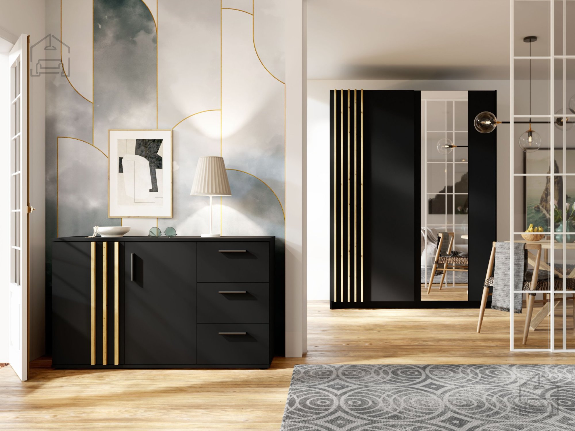 Das Besondere an diesem Modell ist die raffinierte Kombination aus laminierten Fronten mit MDF-Leisten im warmen Eichenton Artisan, die dem Raum einen Hauch natürlicher Eleganz verleihen. Die schwarze Farbe des Korpus sorgt für ein edles Erscheinungsbild, das sich hervorragend mit verschiedenen Farbkombinationen der Inneneinrichtung kombinieren lässt. Dank ihrer Vielseitigkeit ist die Kommode sowohl für klassische als auch für moderne Interieurs geeignet, da sie sich unterschiedlichen Einrichtungsstilen anpasst.