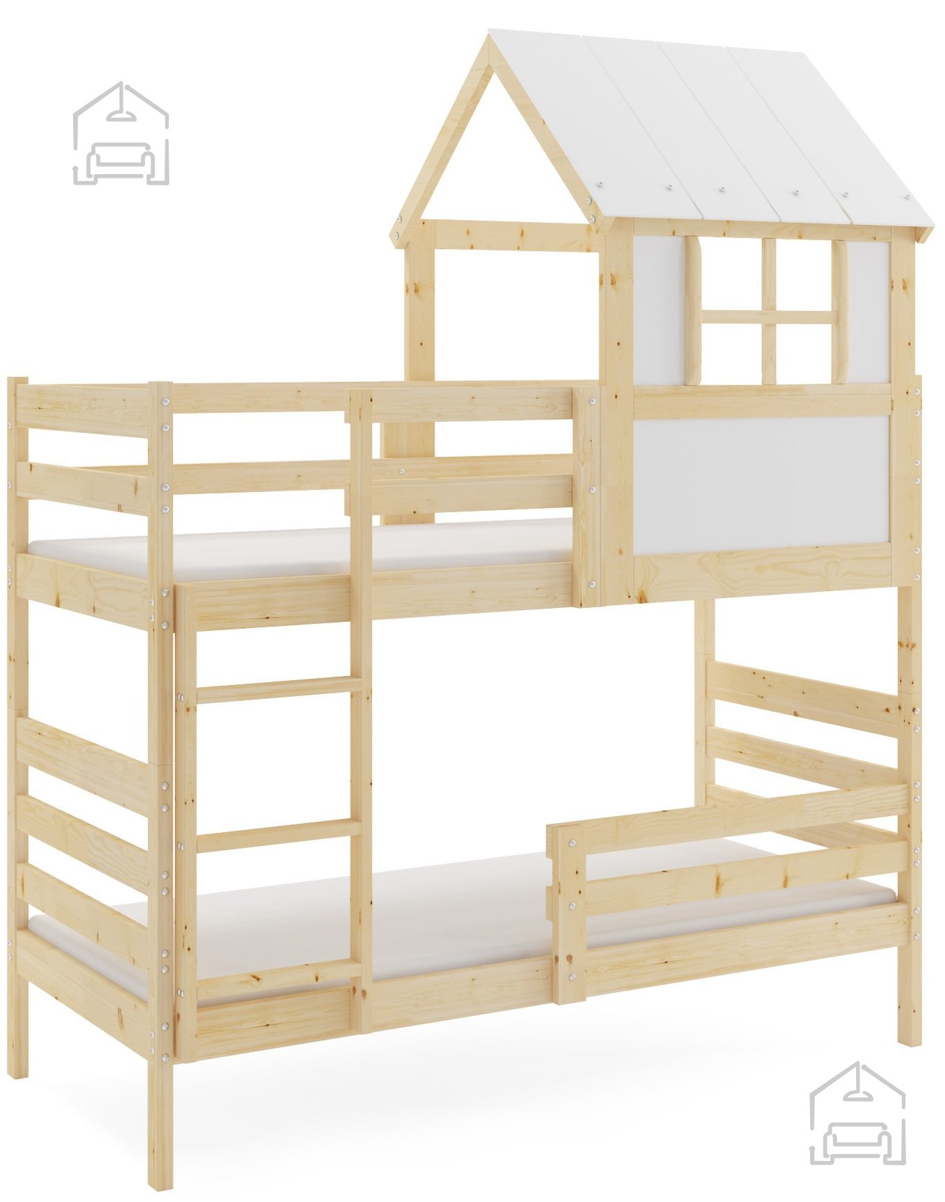 Kinderfantasie kennt keine Grenzen – besonders dann, wenn es um einen Raum geht, in dem Träume Wirklichkeit werden. Genau deshalb ist dieses wunderschöne Holz-Etagenbett in Hausform die perfekte Wahl für moderne Familien, die Praktikabilität, Sicherheit und verspieltes Design verbinden möchten. Es wurde so entworfen, dass es zwei Kindern einen bequemen Schlafplatz bietet und gleichzeitig eine angenehme Umgebung zum Spielen, Kreativsein und Entspannen schafft. Seine natürliche Kiefernholzfarbe passt hervorragend in jedes Kinderzimmer und erfüllt es mit Wärme, Frische und einem Hauch von Natur.