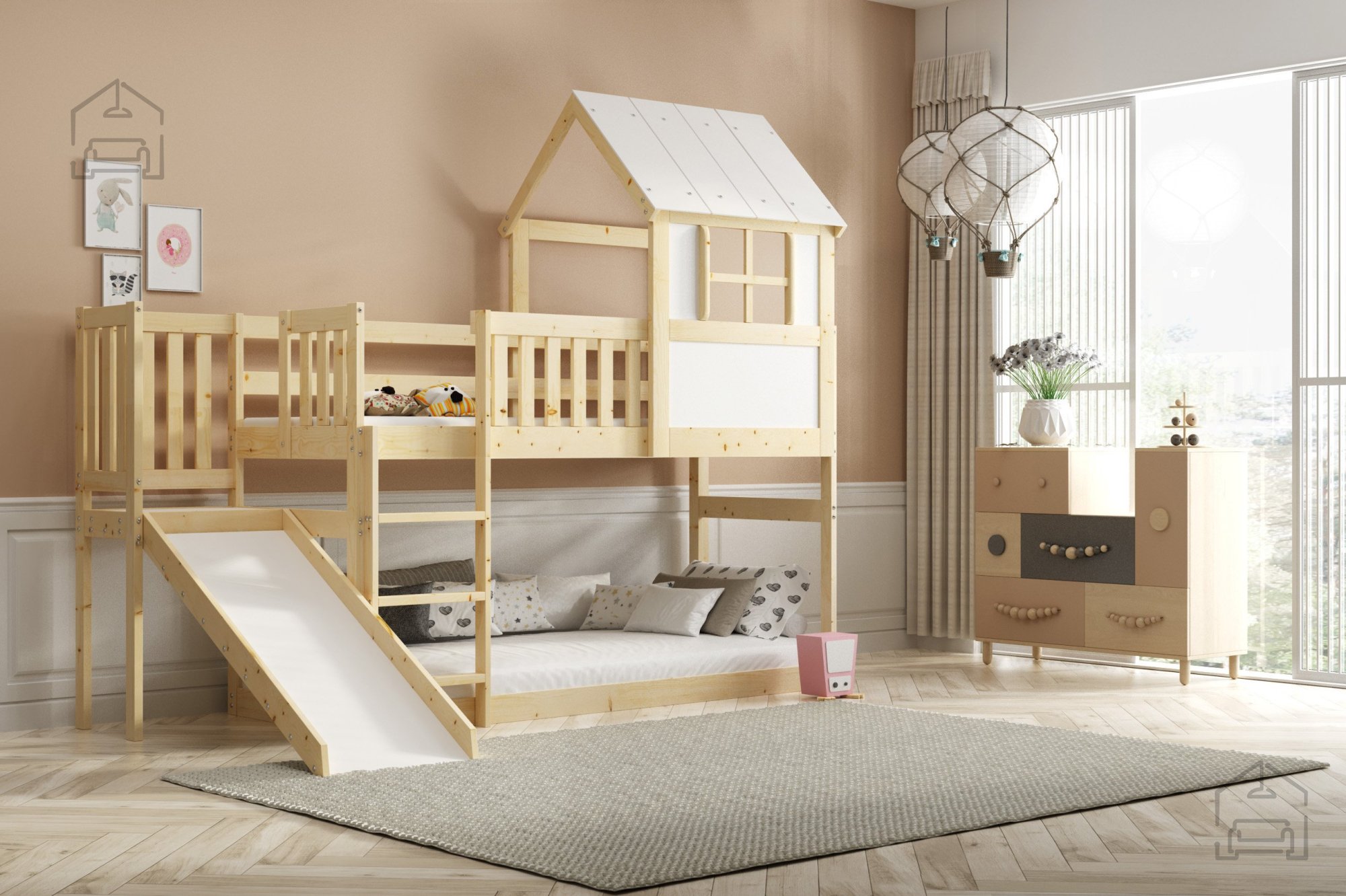 Schaffen Sie eine zauberhafte Ecke zum Schlafen und Spielen, die jedes Kind begeistern wird. Das Etagenbett Antresola niedrig Domek in den Maßen 90x200 cm ist die perfekte Wahl für Eltern, die Funktionalität, Sicherheit und ein ästhetisch anspruchsvolles Design vereinen möchten. Es ist aus hochwertigem Kiefernholz gefertigt, was ihm ein natürliches Aussehen verleiht und gleichzeitig eine lange Lebensdauer und Stabilität gewährleistet. Sein Häuschen-Design weckt die Fantasie der Kinder, regt zum Spielen an und schafft ein angenehmes Gefühl von Geborgenheit.