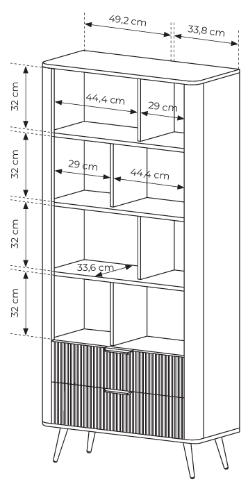 Die gesamte Konstruktion besteht aus Spanplatte E05 16 mm und ist mit MDF-Elementen veredelt, was eine lange Lebensdauer und Widerstandsfähigkeit gegen den täglichen Gebrauch garantiert. ABS-Kanten bieten zusätzlichen Schutz vor Stößen und Abnutzung, sodass das Regal auch nach Jahren seinen makellosen Look behält. Die Metallfüße sind nicht nur ein ästhetisches Detail, sondern sorgen auch für Stabilität und eine einfache Reinigung unter dem Möbelstück.