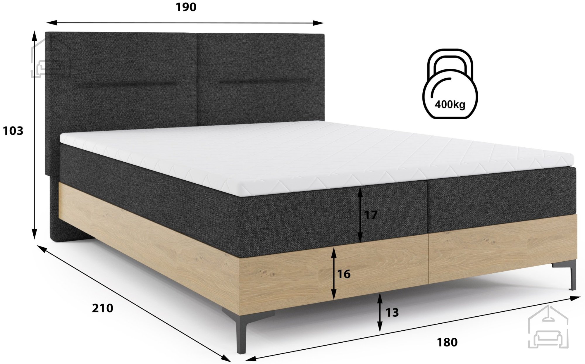 Mit den Maßen 190x210x103 cm eignet sich dieses Bett perfekt für großzügige Schlafzimmer, in denen Sie ein Gefühl von Prestige und absolutem Komfort schaffen möchten. Dank seiner Höhe und der eleganten Polsterung ist es besonders praktisch und bietet einen einfachen Zugang zur Liegefläche. Die Farbkombination Kiefer/Eiche und Graphit erlaubt eine harmonische Abstimmung mit verschiedenen Möbelstücken und Dekoren – von minimalistisch bis traditionell.