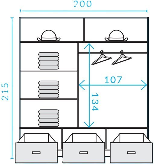 Er ist aus hochwertigen laminierten Platten, MDF und Holz gefertigt, was eine lange Lebensdauer und Widerstandsfähigkeit gegenüber täglichem Gebrauch gewährleistet. Die Schiebetüren sind eine äußerst praktische Lösung, da sie beim Öffnen keinen zusätzlichen Platz beanspruchen – das bedeutet, dass sich der Schrank auch hervorragend in kleinere Räume einfügt, in denen jeder Zentimeter kostbar ist. Außerdem ermöglicht der Mechanismus der Schiebetüren eine einfache und leise Nutzung, was zu noch mehr Komfort beiträgt.