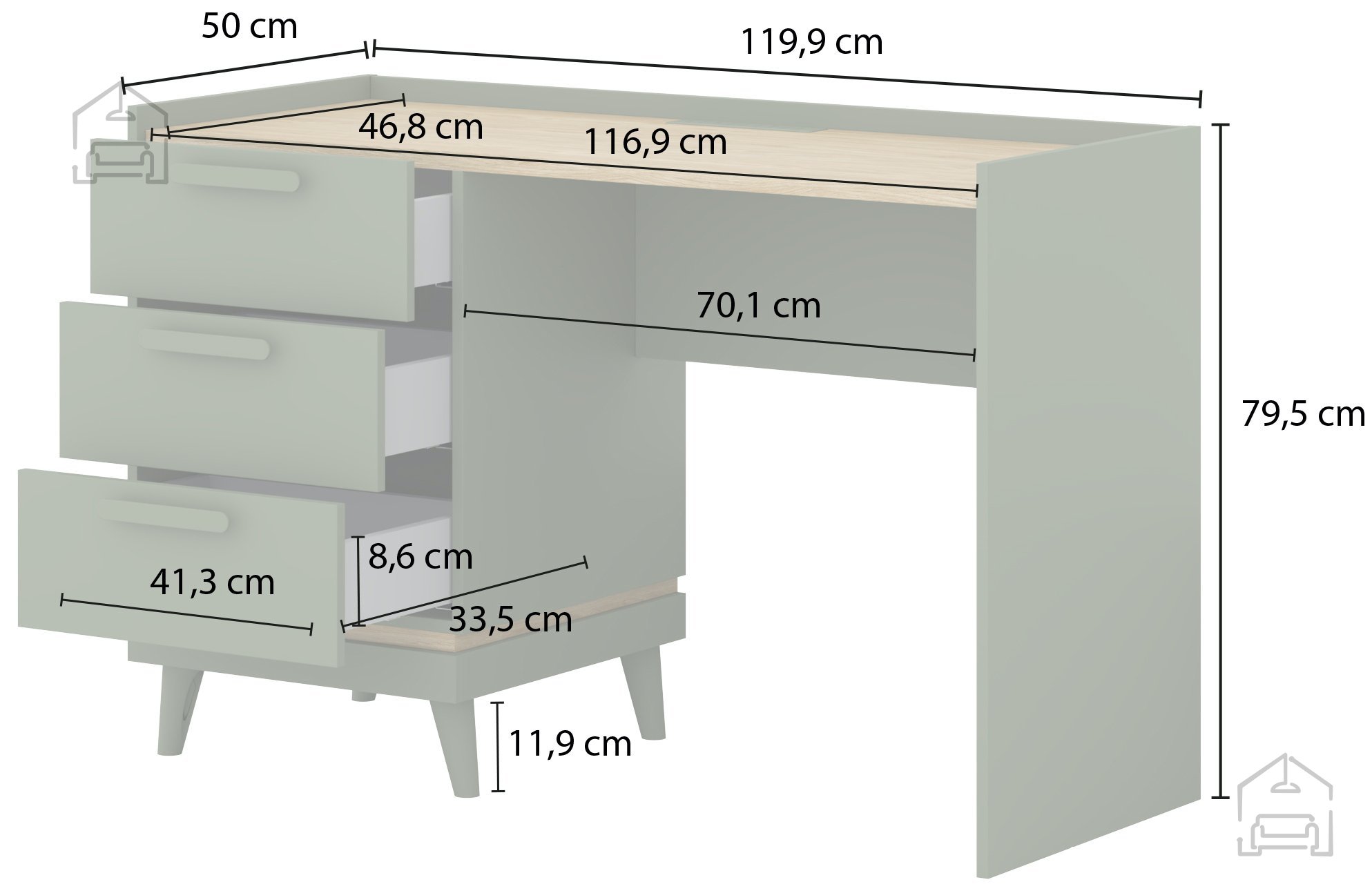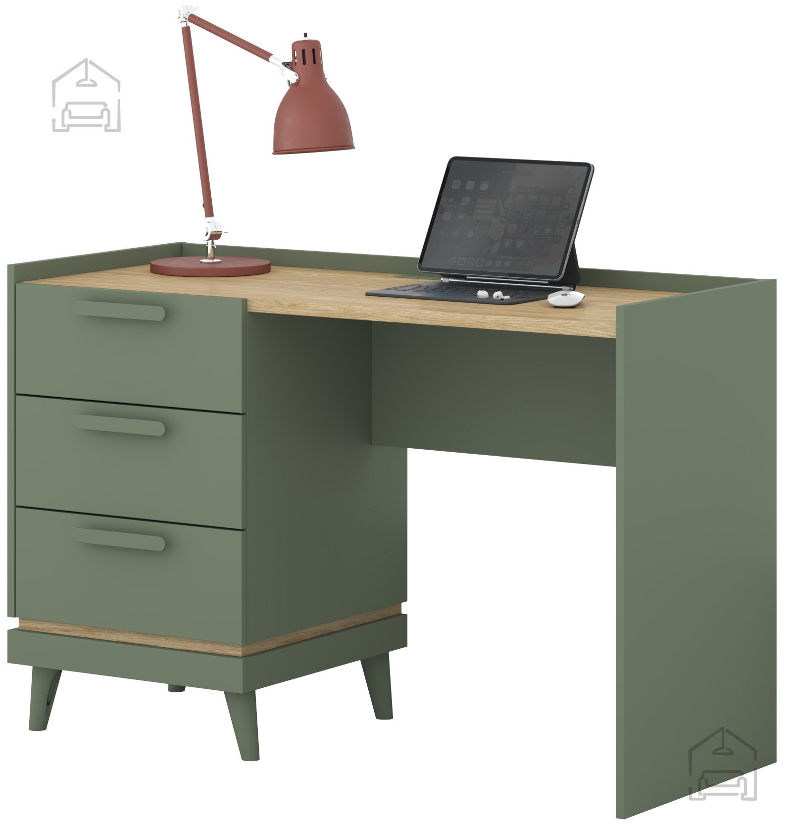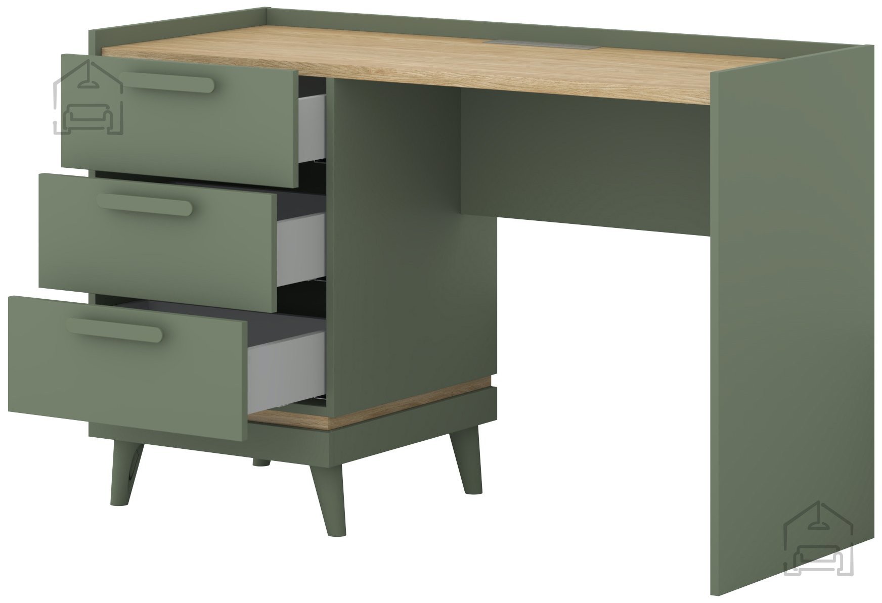 Gestalten Sie sich den perfekten Arbeitsplatz zum Arbeiten, Lernen oder Kreativsein mit einem modernen und funktionalen Schreibtisch, der skandinavische Ästhetik mit praktischer Zweckmäßigkeit verbindet. Die Kombination aus einem warmen Ton von verblasster grün geölter Eiche und frischem Grün bringt einen Hauch von Natur in jeden Raum. Klare Linien, minimalistisches Design und durchdachte Details sorgen dafür, dass der Tisch sowohl in moderne Wohnungen als auch in klassische Interieurs wunderbar passt.