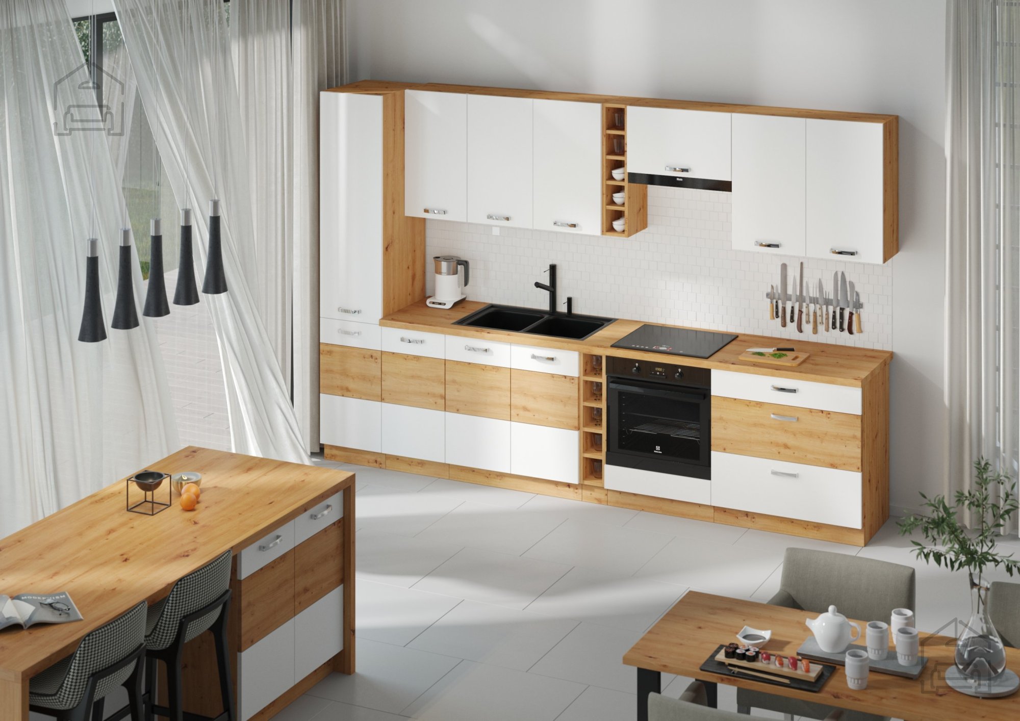 Der Schrank ist aus einer hochwertigen laminierten Platte mit einer Stärke von 16 mm gefertigt, was Festigkeit und Langlebigkeit gewährleistet. Die weiße Hochglanzfront im Kontrast zur natürlichen Wärme der Eiche Artisan schafft ein modernes und zugleich angenehmes Erscheinungsbild, das sowohl zu modernen als auch zu klassischen Küchen hervorragend passt. Der silbermatte Griff verleiht einen Hauch von Eleganz und ist zugleich praktisch für den täglichen Gebrauch.