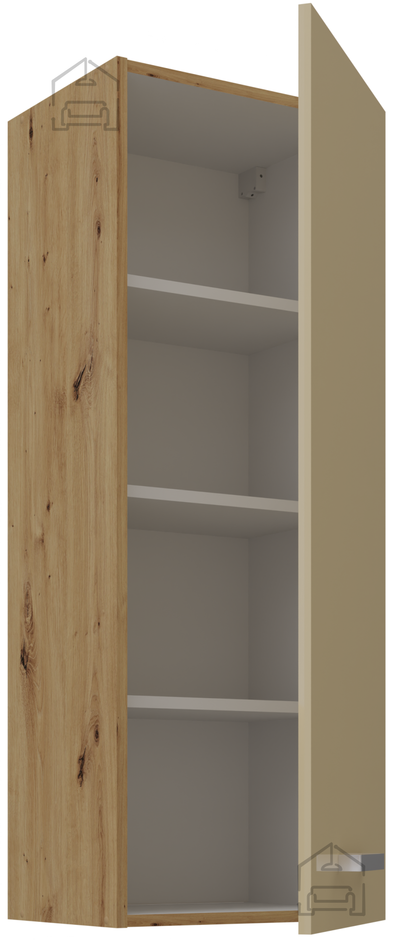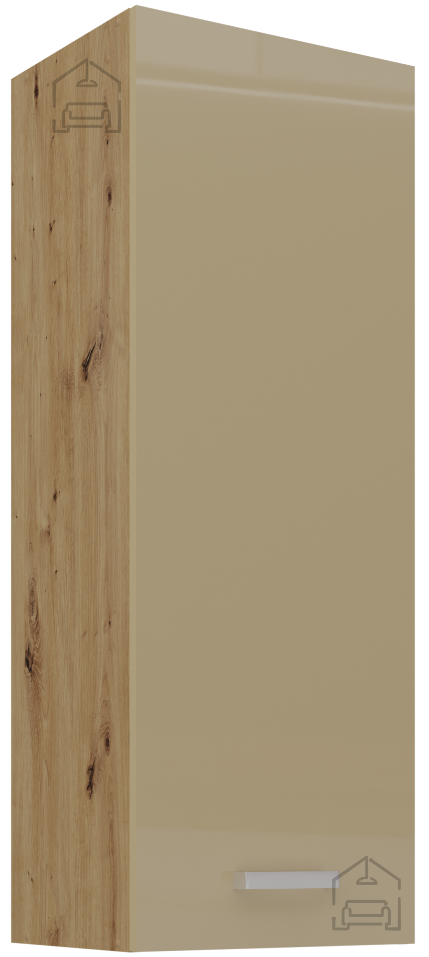 Bei der Herstellung wird eine laminierte Platte mit einer Stärke von 16 mm verwendet, die Robustheit und Langlebigkeit gewährleistet. Hervorzuheben ist auch die gewählte Farbkombination – der Korpus in einem warmen Farbton von Eiche Artisan wird durch eine Front in Hochglanz Cappuccino ergänzt. Dieser Kontrast schafft ein modernes und zugleich gemütliches Erscheinungsbild, das sowohl in klassisch als auch modern eingerichtete Räume hervorragend passt.