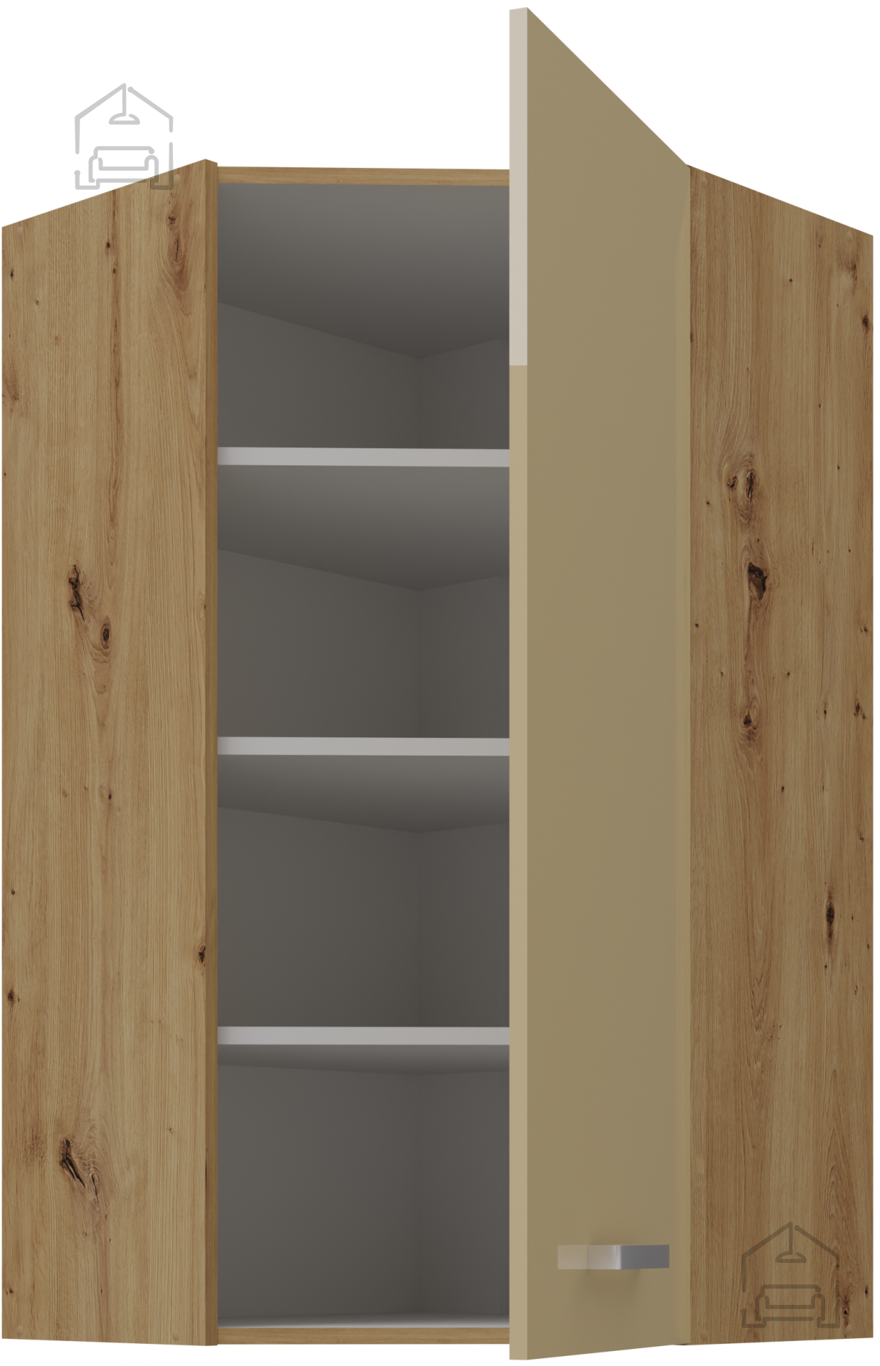 Lassen Sie wertvolle Ecken nicht ungenutzt. Mit der Wahl dieses oberen Eckschranks gewinnen Sie zusätzlichen Stauraum und schaffen gleichzeitig ein ästhetisch vollendetes Erscheinungsbild Ihrer Küche. Investieren Sie in Möbel, die alles vereinen, was Sie brauchen – Qualität, Eleganz und Funktionalität. Machen Sie Ihre Küche zu einem Raum, in dem Sie sich jeden Tag wohl, organisiert und inspiriert fühlen.