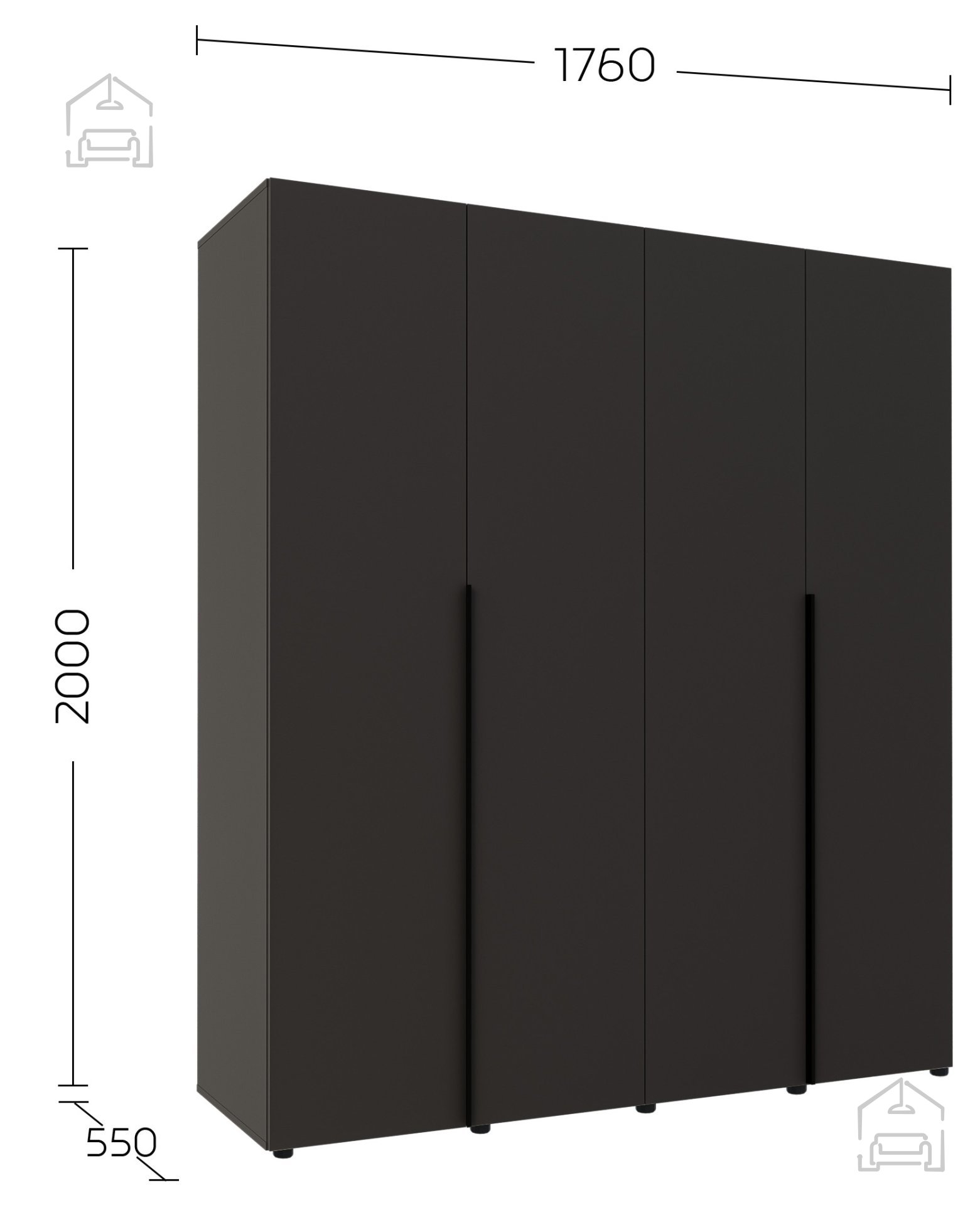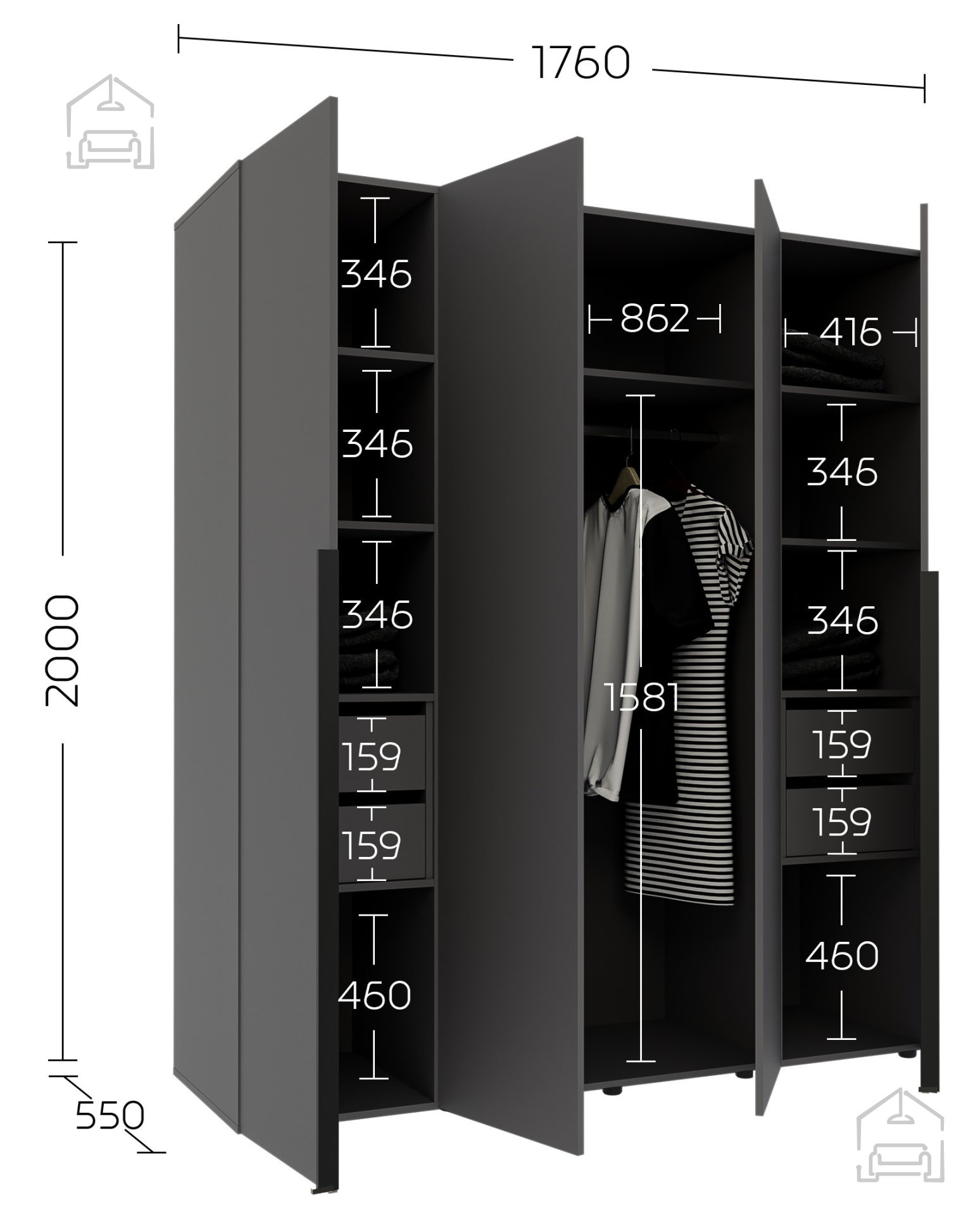 Der Schrank mit den Maßen 176×55×200 cm ist so konzipiert, dass er viel Stauraum bietet und dennoch nicht zu viel Platz im Raum einnimmt. Im Inneren ermöglicht er eine übersichtliche Anordnung von Kleidung, Schuhen und Modeaccessoires, sodass Ihr Alltag besser organisiert und einfacher wird. Dank der vier Türen ist der Zugriff auf den Inhalt stets praktisch und schnell.