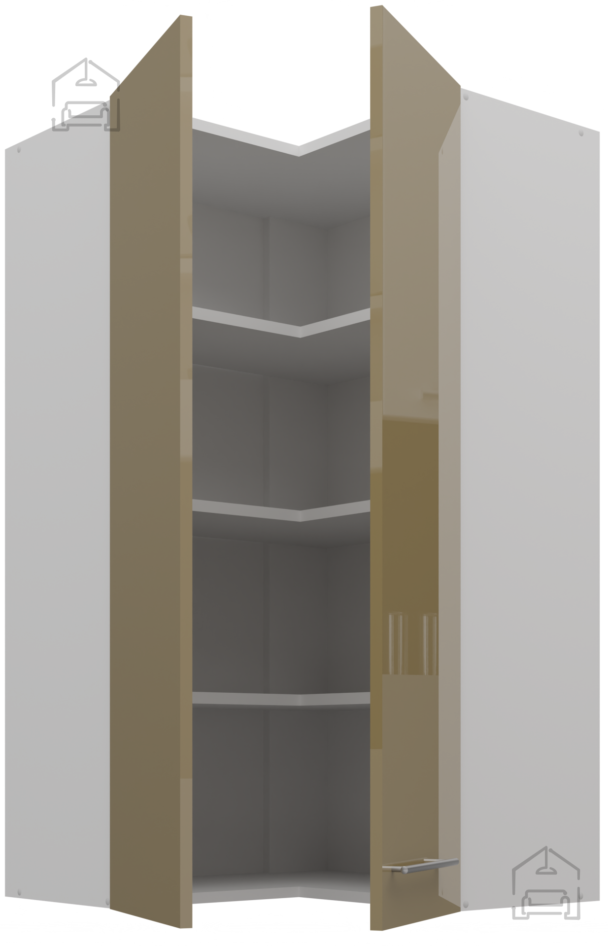 Wenn Sie eine Küche wünschen, die nicht nur schön anzusehen, sondern auch durchdacht gestaltet ist, ist dieser obere Eckschrank die richtige Lösung. Mit seiner kompakten Größe und den durchdachten Details ist er die ideale Wahl sowohl für kleinere als auch für größere Küchen. Er bietet den Raum, den Sie benötigen, und sein Design wird niemals aus der Mode kommen.