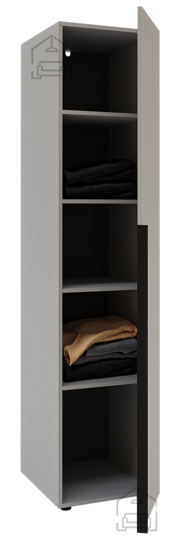 Das Innere des Kleiderschranks ist auf optimale Aufbewahrung ausgelegt. Mehrere geräumige Regale ermöglichen eine geordnete Aufbewahrung von Kleidung, Bettwäsche, Taschen oder anderen persönlichen Gegenständen. Aufgrund der einflügeligen Tür ist der Schrank die ideale Wahl für kleinere Räume, in denen jeder Quadratzentimeter wichtig ist, und trotz der kompakten Maße (45x55x200 cm) bietet er überraschend viel nutzbaren Stauraum.