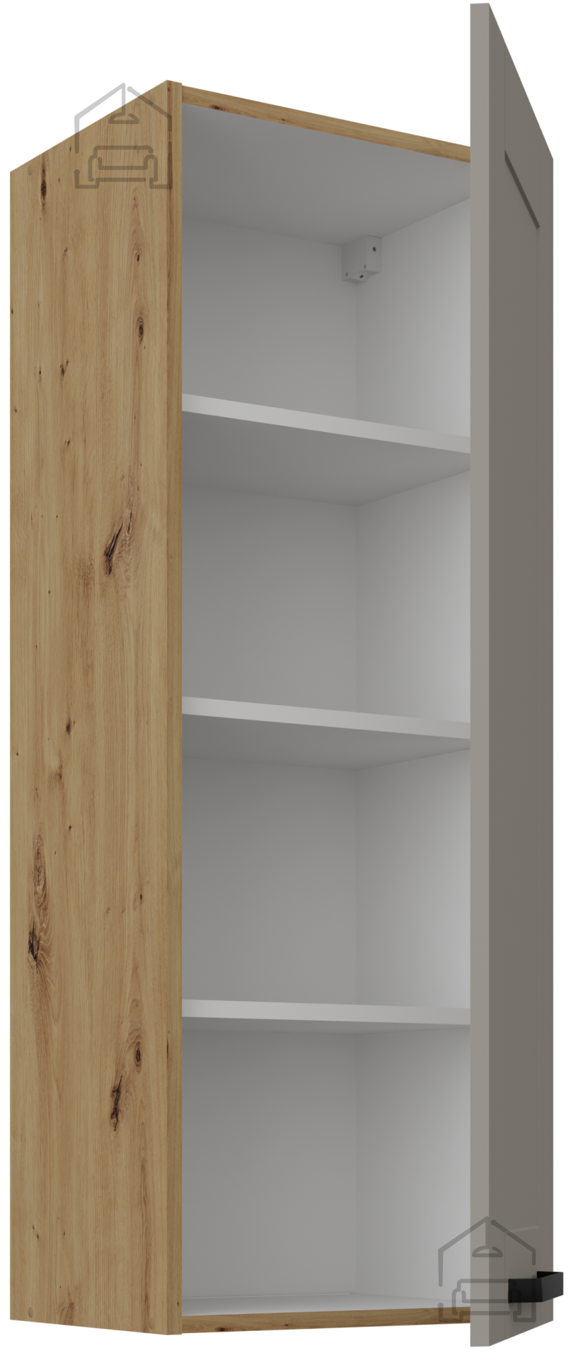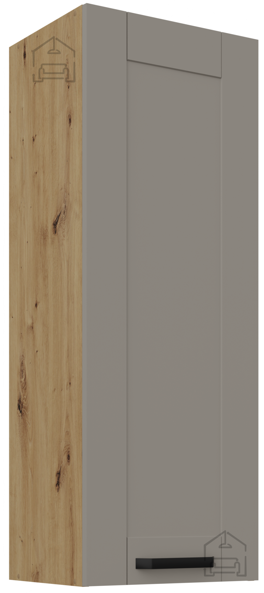 Eine elegante und funktionale Lösung für jede Küche, die modernes Design mit der Wärme natürlicher Töne vereint. Der Oberschrank Luna in der Kombination Claygrey und Eiche Artisan ist die perfekte Wahl für alle, die sich einen praktischen Stauraum wünschen und gleichzeitig ein ästhetisch vollendetes Möbelstück suchen. Mit seinen kompakten Abmessungen von 40x31x107,5 cm passt er problemlos auch in kleinere Küchen und bietet dennoch ausreichend Platz für Ihre Küchenutensilien, Gewürze oder Geschirr.