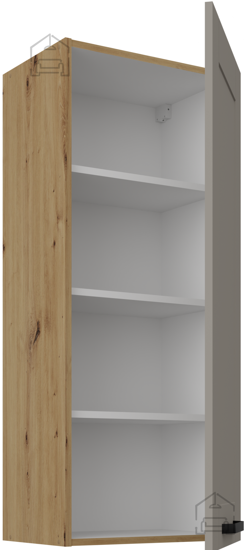 Das Besondere an diesem Schrank ist die sorgfältig ausgewählte Farbkombination – der neutrale Farbton Claygrey im Kontrast zum warmen Ton der Eiche Artisan schafft eine angenehme Harmonie, die sowohl zu modernen als auch zu klassischen Küchen passt. Die laminierte Platte, aus der der Korpus gefertigt ist, gewährleistet eine lange Lebensdauer, einfache Reinigung und Widerstandsfähigkeit im täglichen Gebrauch. Der Metallgriff sorgt zudem für ein zeitloses Erscheinungsbild und eine zuverlässige Nutzung.