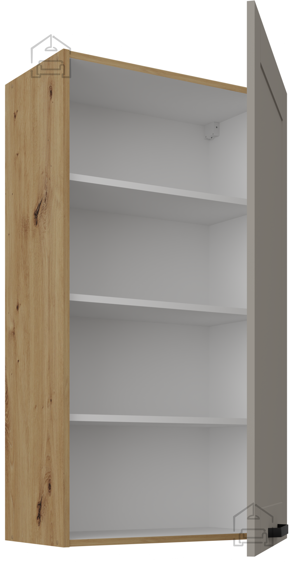 Das Besondere an diesem Schrank ist die sorgfältig ausgewählte Farbkombination – der neutrale Claygrey-Ton im Kontrast zum warmen Ton der Eiche Artisan schafft eine angenehme Harmonie, die sowohl zu modernen als auch zu klassischen Küchen passt. Die laminierte Platte, aus der der Korpus gefertigt ist, sorgt für eine lange Lebensdauer, einfache Reinigung und Widerstandsfähigkeit im täglichen Gebrauch. Der Metallgriff verleiht zudem ein zeitloses Aussehen und zuverlässige Handhabung.