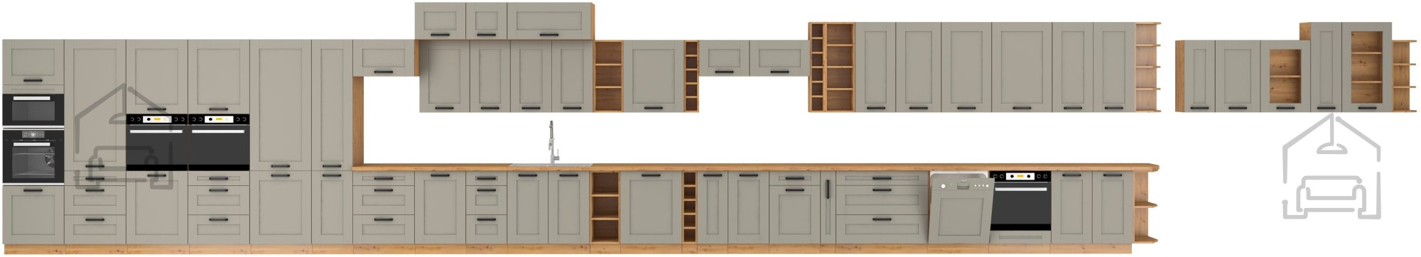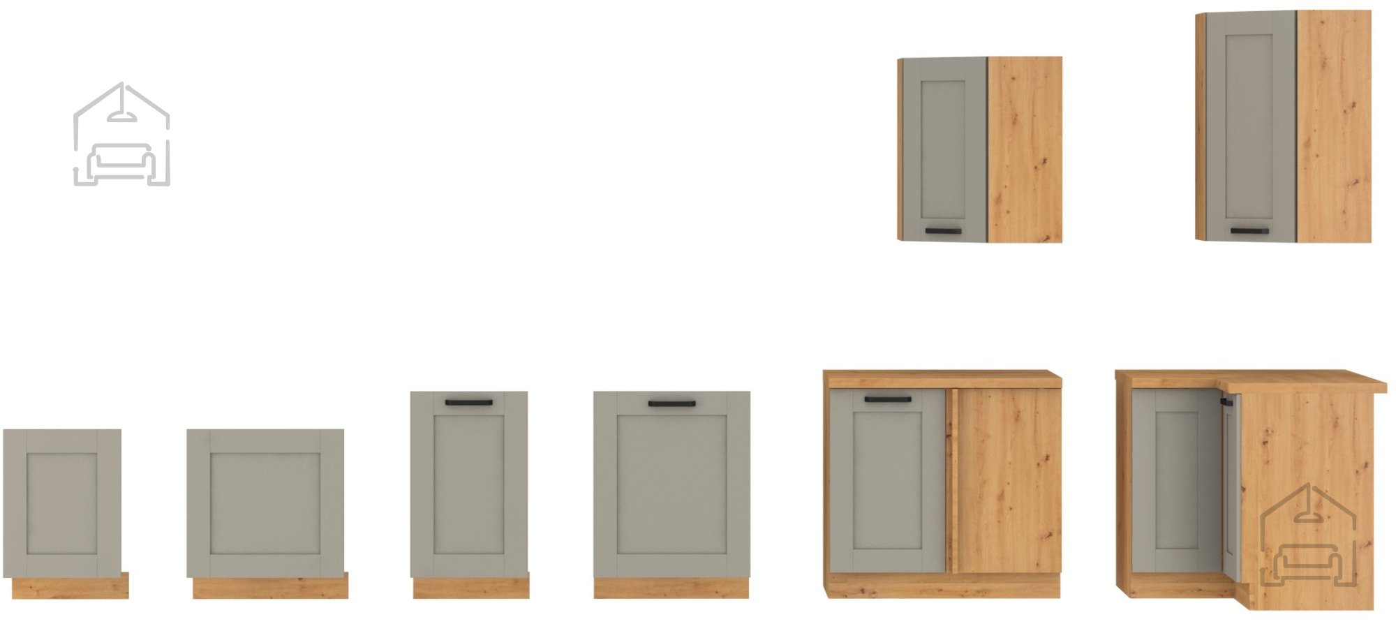 Das Besondere an diesem Schrank ist die sorgfältig ausgewählte Farbkombination – der neutrale Ton claygrey im Kontrast zum warmen Farbton der Eiche artisan schafft eine angenehme Harmonie, die sowohl zu modernen als auch klassischen Küchen passt. Die laminierte Platte, aus der der Korpus gefertigt ist, gewährleistet eine lange Lebensdauer, einfache Reinigung und Widerstandsfähigkeit bei täglicher Nutzung. Der Metallgriff sorgt zudem für ein zeitloses Erscheinungsbild und eine zuverlässige Handhabung.
