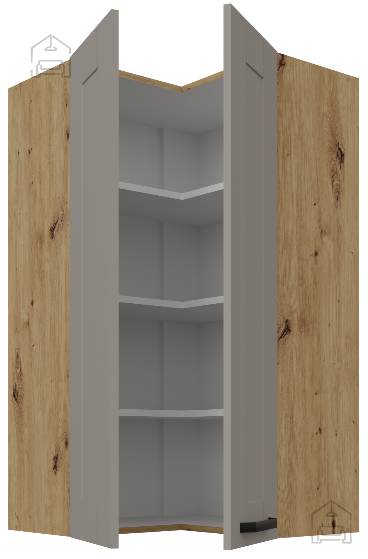 Eine elegante und funktionale Lösung für jedes moderne Zuhause, die Ästhetik, Qualität und Praktikabilität vereint. Der obere Eckschrank in der Farbkombination claygrey und Eiche Artisan ist so konzipiert, dass er auch die kleinste Ecke Ihrer Küche optimal nutzt und gleichzeitig eine warme und angenehme Atmosphäre schafft. Sein durchdachtes Design ermöglicht eine einfache Integration in verschiedene Einrichtungsstile – von minimalistisch bis traditionell.