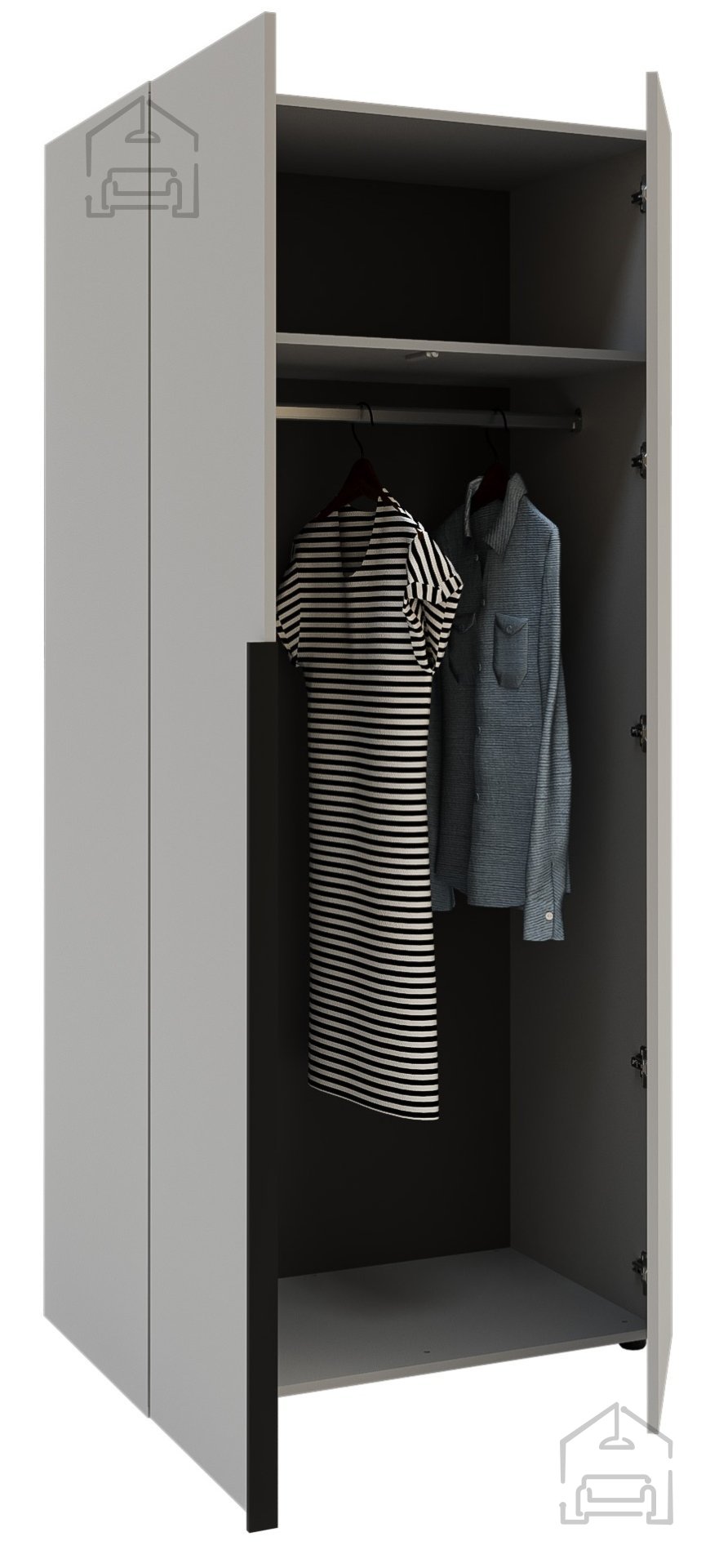 Der elegante und funktionale Kleiderschrank in grauer Farbe ist eine ausgezeichnete Lösung für jedes Zuhause, in dem Ordnung und Sauberkeit wichtig sind. Mit seinem kompakten, aber geräumigen Design (90x55x200 cm) passt er perfekt sowohl in kleinere als auch in größere Räume. Aufgrund der neutralen Farbe kann er leicht mit verschiedenen Möbelstilen kombiniert werden, von modern-minimalistisch bis klassisch. Der Schrank besteht aus einer hochwertigen laminierten Platte mit einer Stärke von 16 mm, was eine lange Lebensdauer und einfache Pflege gewährleistet.