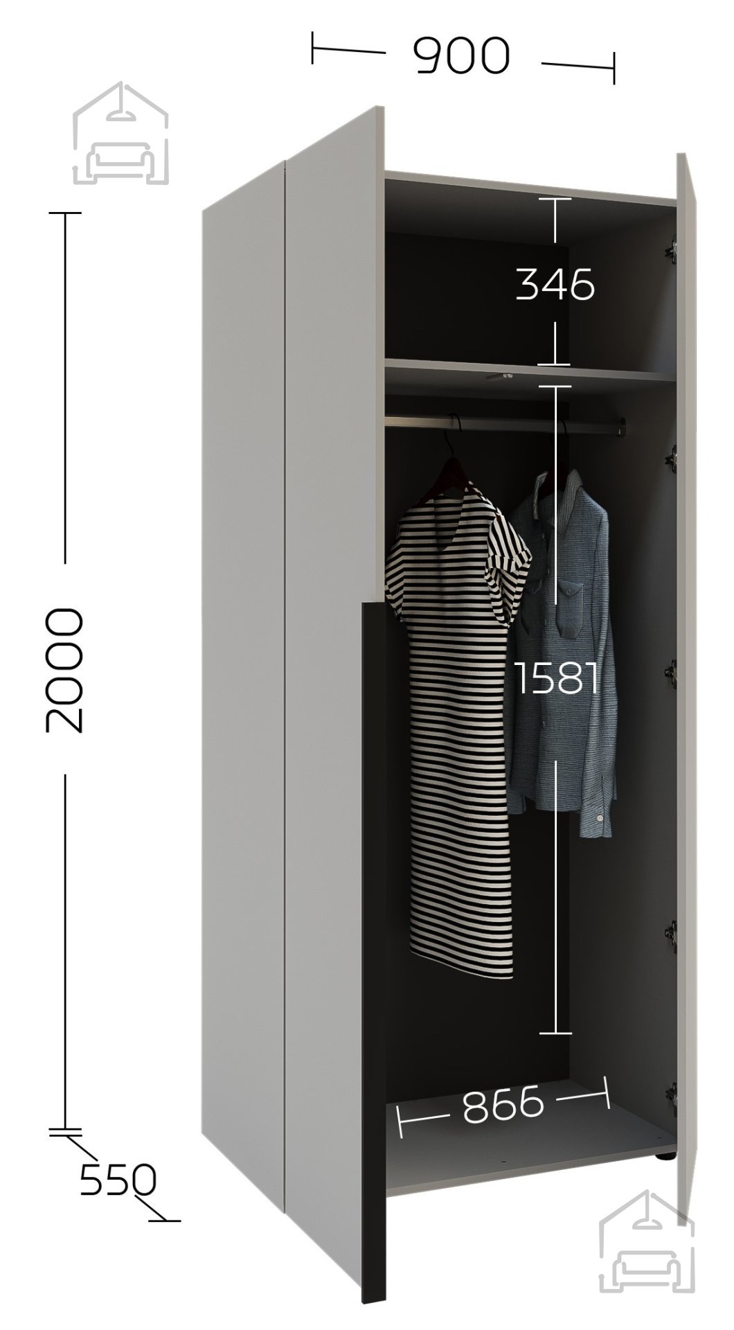Da der Schrank 200 cm hoch ist, nutzt er den Raum in der Höhe optimal aus, was besonders in kleineren Wohnungen praktisch ist. Die Breite von 90 cm und die Tiefe von 55 cm bieten ausreichend Platz für Kleiderbügel, Boxen und Organizer. Er lässt sich leicht mit vorhandenen Möbeln kombinieren und wird dank der neutralen Farbe nie unangenehm auffallen oder das Gesamtbild des Raumes stören.