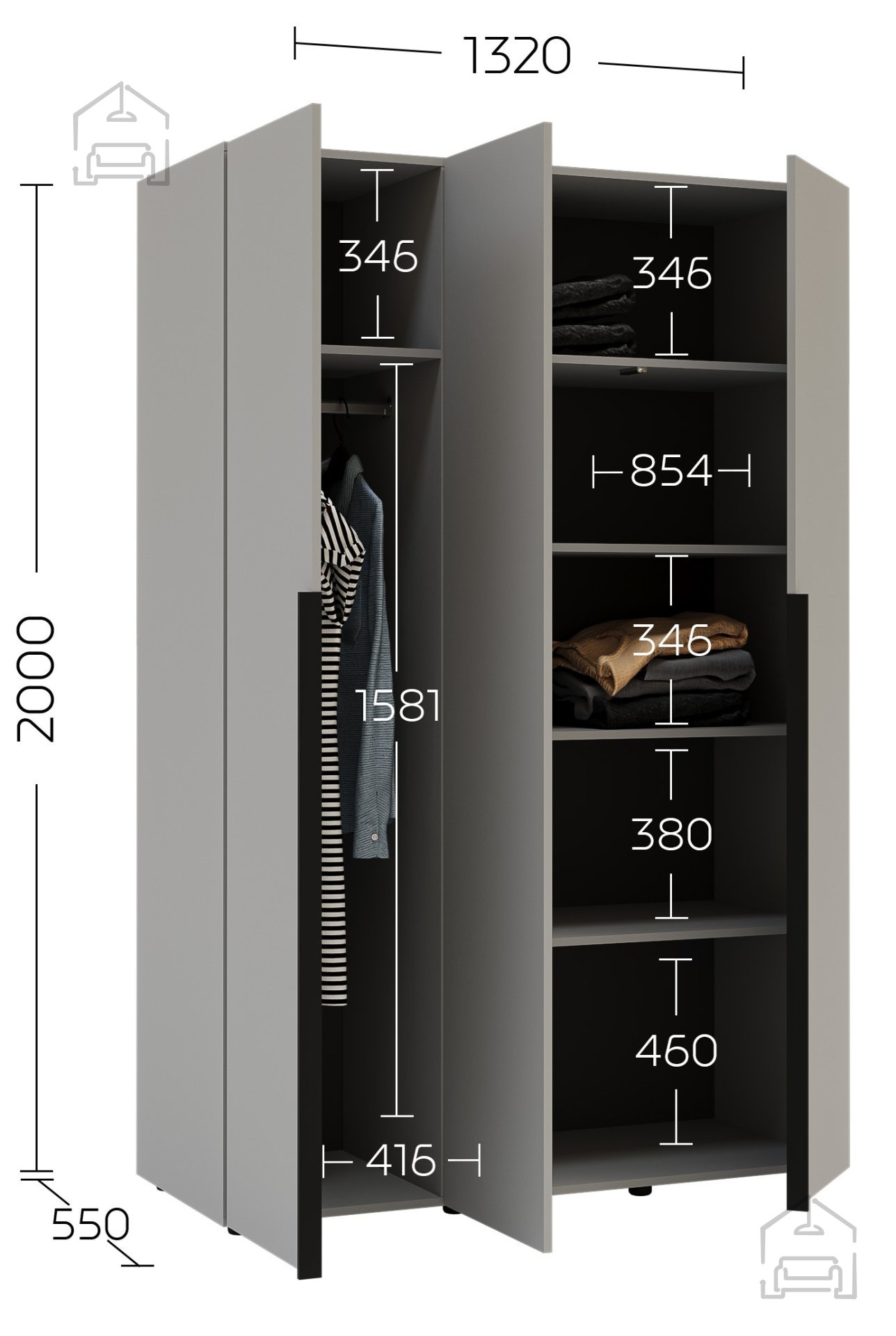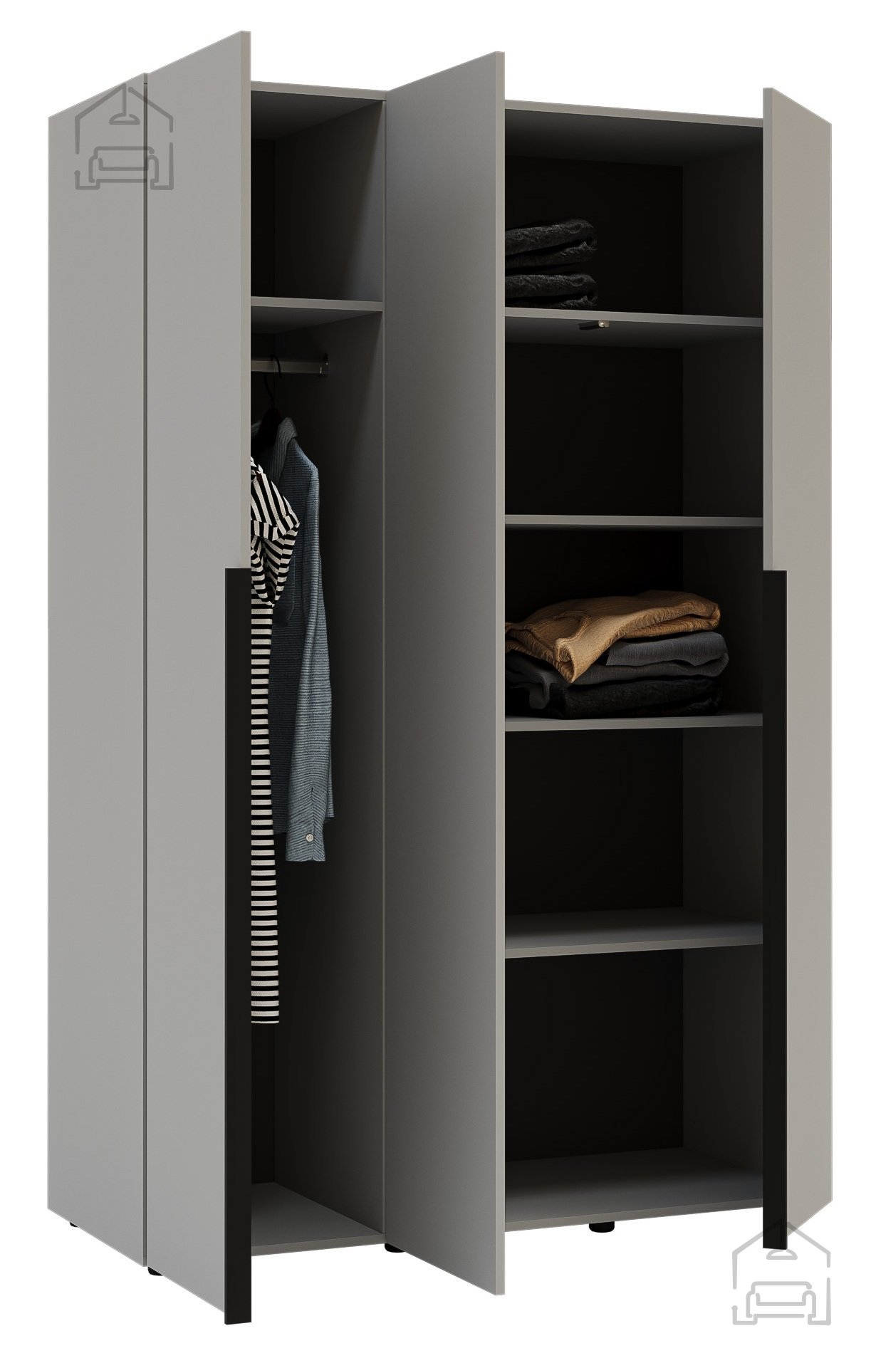 Die Maße 132x55x200 cm ermöglichen eine optimale Raumnutzung in jedem Zuhause. Das Innere ist so gestaltet, dass eine übersichtliche Aufbewahrung möglich ist – nutzen Sie größere Fächer zum Aufhängen von Kleidung, Regale für gefaltete Stücke und Platz für Accessoires. Der Schrank kann auf Wunsch mit einem zusätzlichen Aufsatzschrank erweitert werden, was noch mehr Platz für saisonale Kleidung, Bettwäsche oder Boxen mit Accessoires bietet.