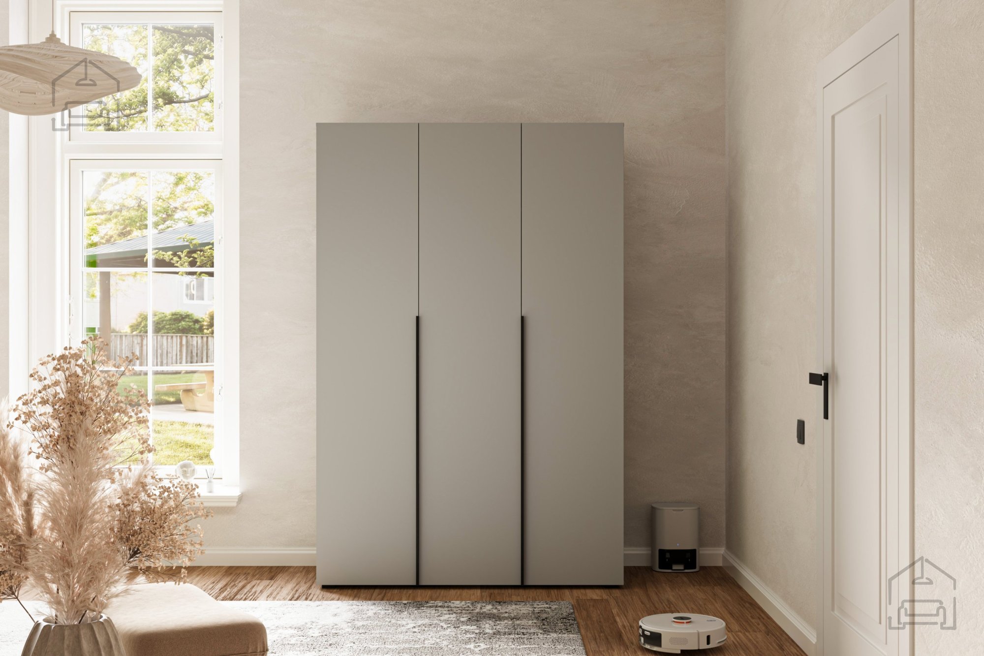 Wenn Sie einen Kleiderschrank wünschen, der zeitlose Eleganz, Praktikabilität und hochwertige Verarbeitung vereint, ist dieser moderne dreitürige Schrank die perfekte Wahl für Ihr Zuhause. Mit seiner raffinierten grauen Farbe passt er hervorragend in jedes moderne oder klassische Interieur und sorgt gleichzeitig mit seinem geräumigen Innenraum für perfekte Organisation Ihrer Kleidung, Modeaccessoires und Bettwäsche. Der Schrank besteht aus einer hochwertigen laminierten Platte mit einer Stärke von 16 mm, was ihm Stabilität, Langlebigkeit und einfache Pflege verleiht.