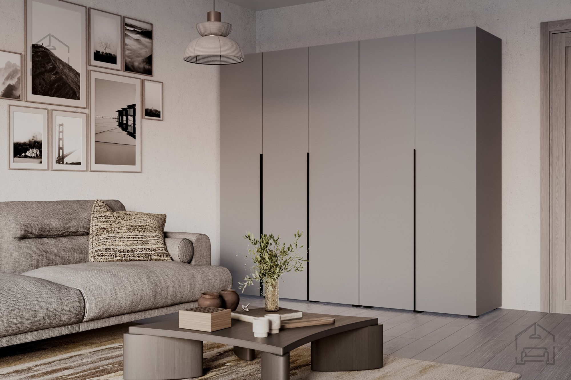 Die graue Farbe schafft ein Gefühl von Ruhe und Eleganz und lässt sich gleichzeitig leicht mit anderen Möbelnuancen im Schlafzimmer oder Flur kombinieren. Die Metallgriffe verleihen einen Hauch von Modernität und sorgen für einen bequemen Griff im täglichen Gebrauch. Eine Besonderheit des Schranks sind die verstellbaren Beine, die im Inneren der Konstruktion verborgen sind und perfekte Stabilität auch auf leicht unebenen Böden ermöglichen. So behält er ein makelloses Aussehen ohne Störungen im Design.
