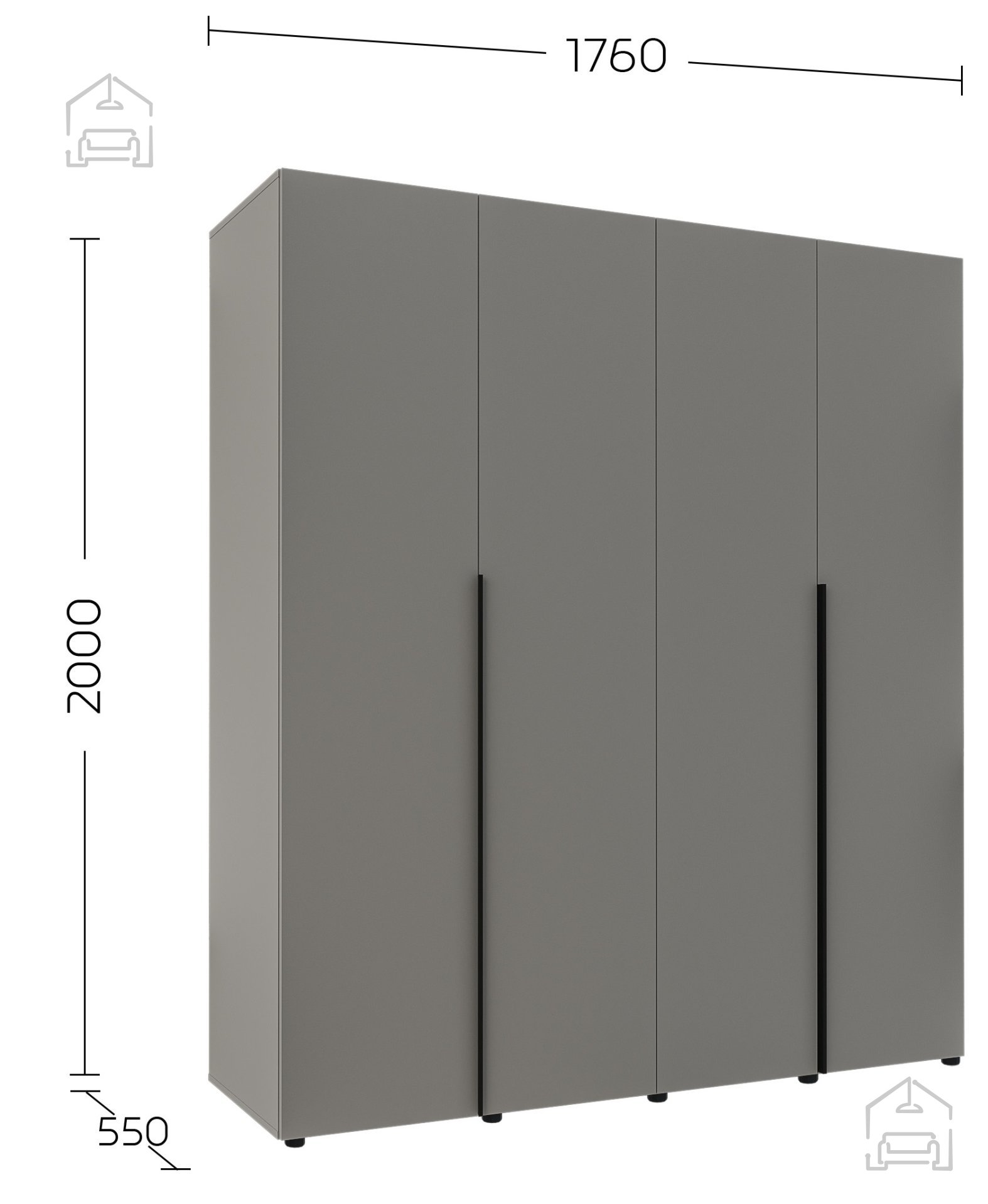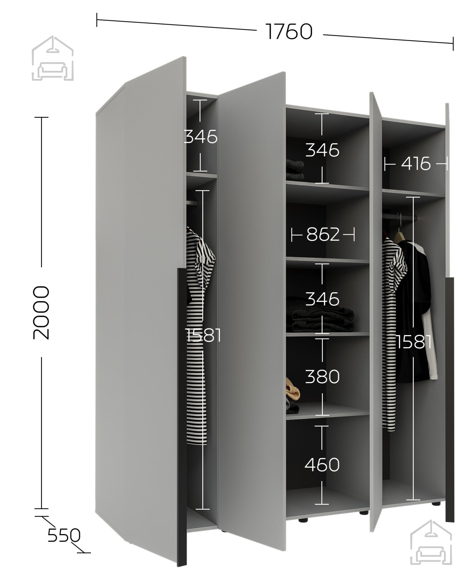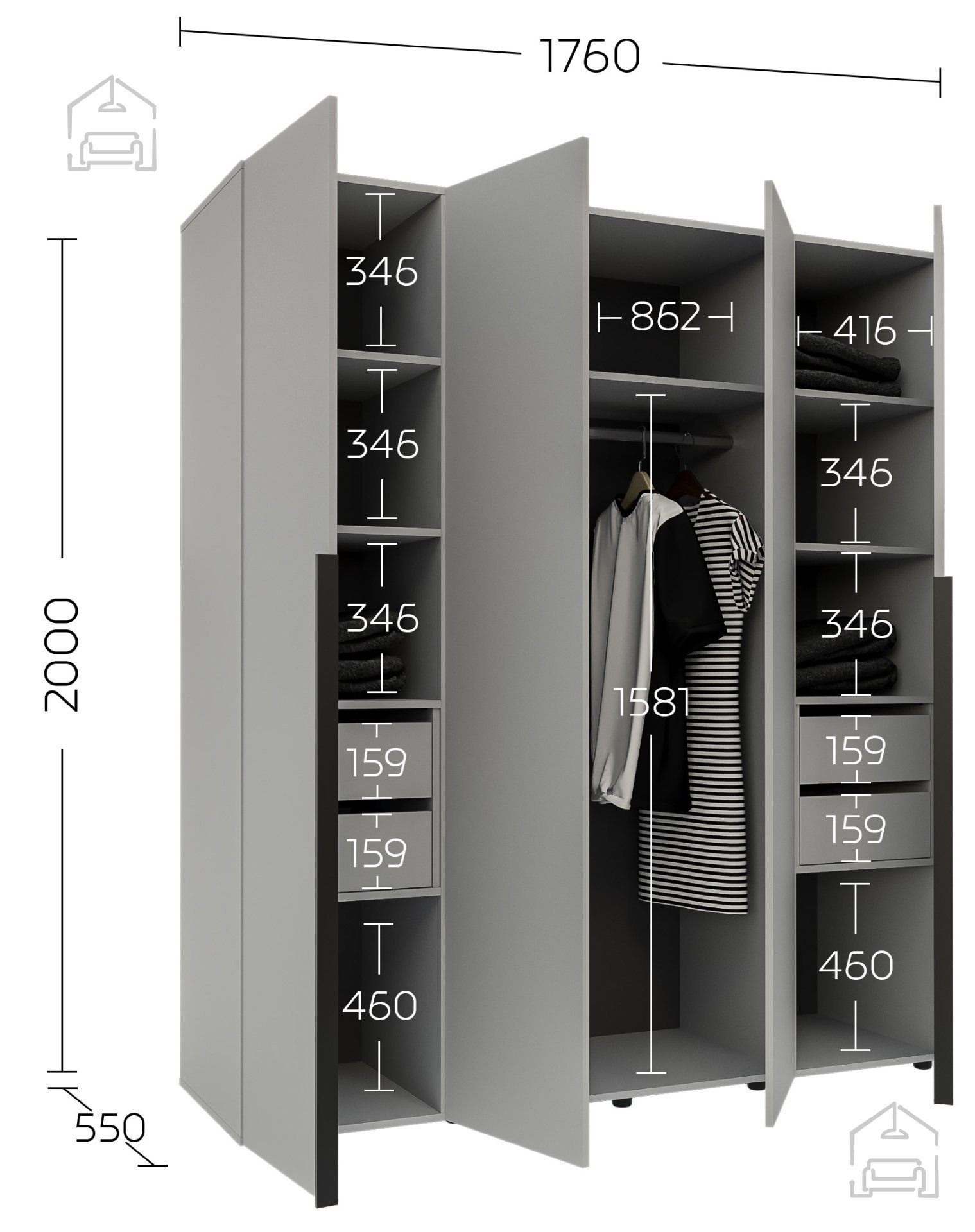 Die Maße 176x55x200 cm ermöglichen eine optimale Raumnutzung, ohne dass der Schrank zu groß oder aufdringlich wirkt. Trotz seiner kompakten äußeren Abmessungen bietet er im Inneren außergewöhnlich viel Stauraum. Darin können Sie problemlos Kleidung, Saisonartikel, Accessoires und Bettwäsche aufbewahren. Mit seiner durchdachten Anordnung von Regalen und Hängeelementen sorgt er für Übersichtlichkeit und einen einfachen Zugang zu allen Gegenständen.