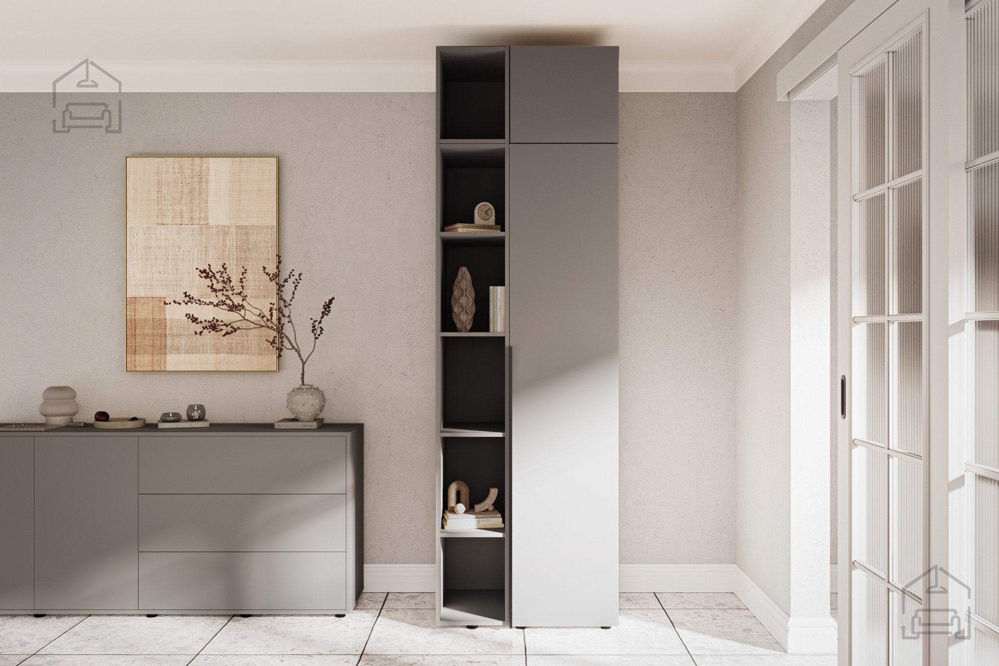 Die graue Farbe schafft einen ruhigen Hintergrund, der es anderen dekorativen Elementen ermöglicht, zur Geltung zu kommen, und gleichzeitig ein Gefühl von Harmonie und moderner Eleganz vermittelt. Dies ist ein Möbelstück, das Sie schnell lieben werden – nicht nur wegen seiner Nützlichkeit, sondern auch wegen seines zeitlosen Aussehens, das perfekt zu aktuellen Interior-Design-Trends passt.
