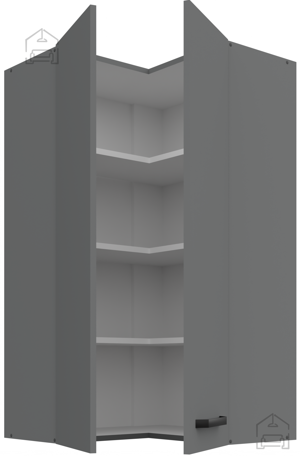 Obere Eckschrank Nessa - 60x60 GN-108 2F (90°) ist die perfekte Wahl für alle, die ihrer Küche ein modernes Aussehen, Funktionalität und makellose Eleganz verleihen möchten. Mit ihrer raffinierten Farbe Anthrazit und der hochwertigen Verarbeitung aus 16 mm starker laminierter Platte vereint sie Langlebigkeit, Ästhetik und Praktikabilität in einem. Es handelt sich um ein Element, das nicht nur der Aufbewahrung dient, sondern auch den Charakter Ihres Zuhauses betont.