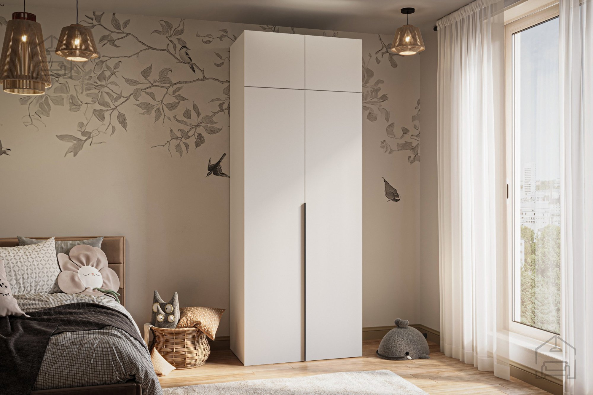 Die Maße des Schranks 90x55x200 cm ermöglichen eine optimale Raumnutzung – er bietet ausreichend Platz zur Aufbewahrung von Kleidung, Bettwäsche oder Accessoires, ohne zu viel Raum im Zimmer einzunehmen. Das Innere ist durchdacht gestaltet, um eine einfache Organisation zu ermöglichen: ein großzügiger Hängeabschnitt für Mäntel, Hemden und Kleider sowie Regale für gefaltete Kleidung oder Boxen.