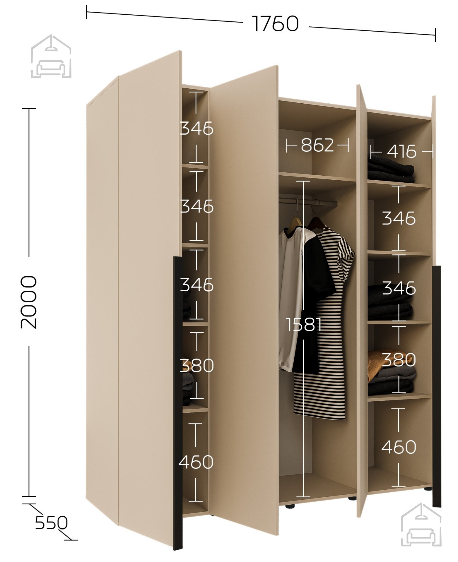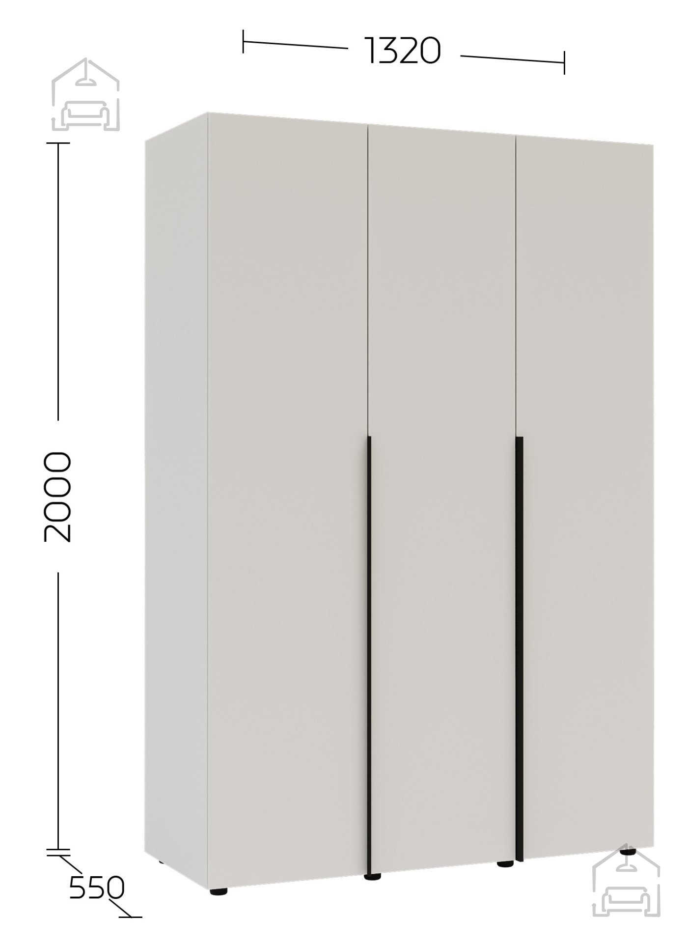 In Zeiten, in denen es wichtig ist, jeden Zentimeter Platz zu nutzen, ist dieser Kleiderschrank die perfekte Wahl für moderne Haushalte. Dank seiner universellen Farbe und kompakten Maße (132x55x200 cm) passt er leicht in kleinere Räume und bietet gleichzeitig ausreichend Platz für Ihre gesamte Garderobe.